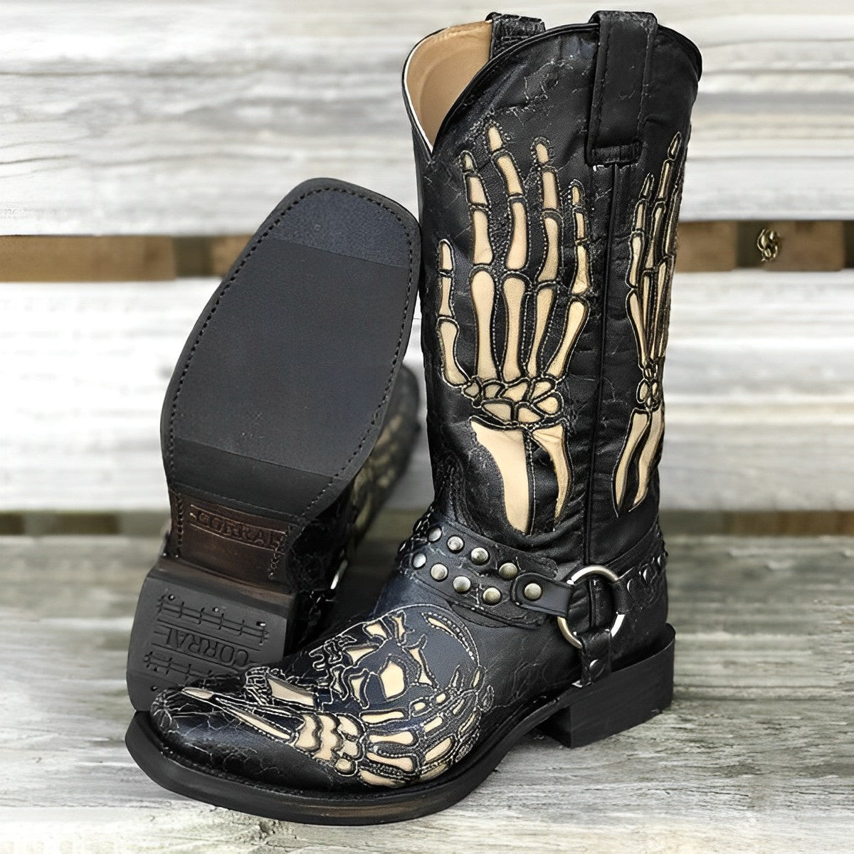 MEN'S VINTAGE SKULL BUCKLE BLACK BIKER BOOTS 90156410S