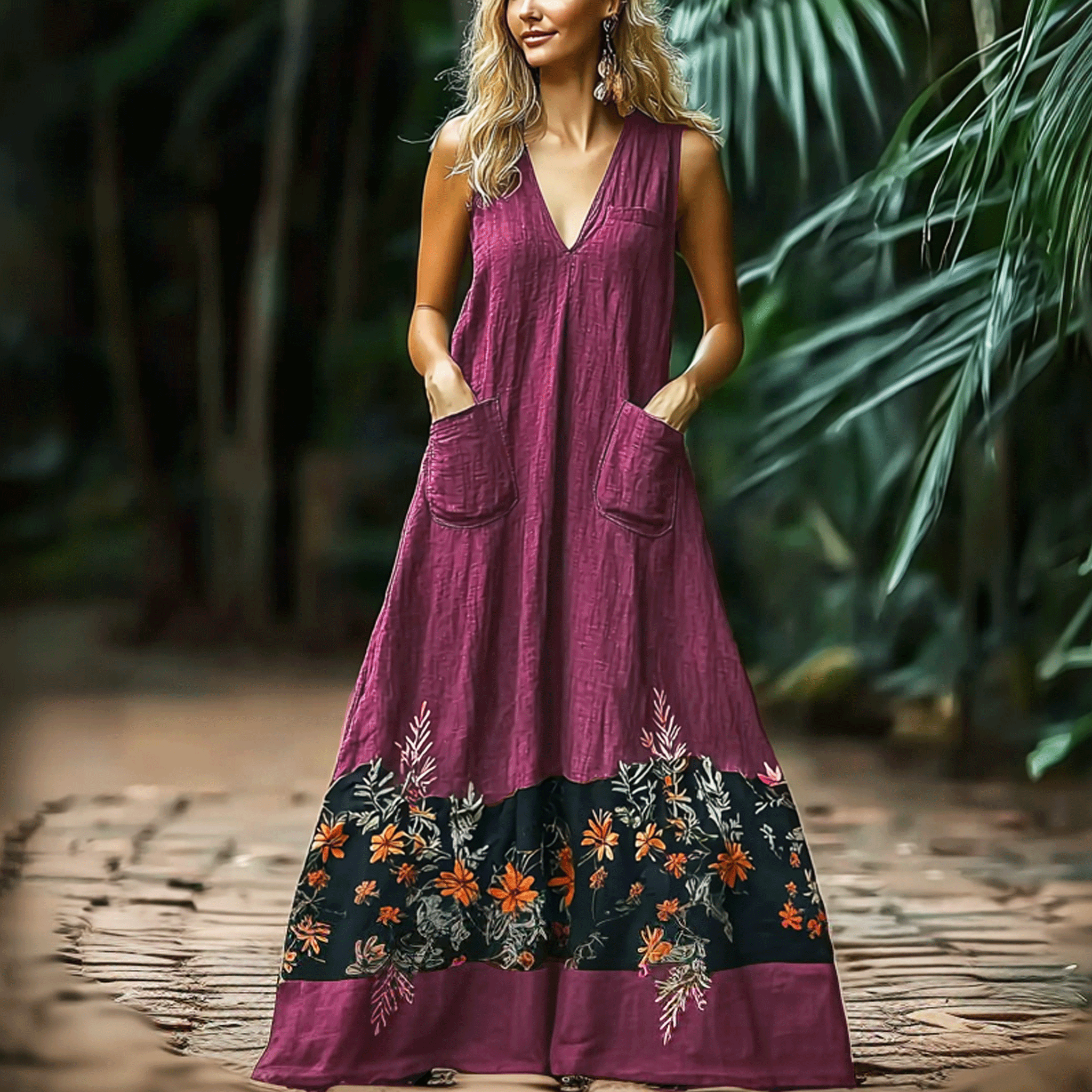 Women's Vintage Contrast Pocket Sleeveless Linen Maxi Dress