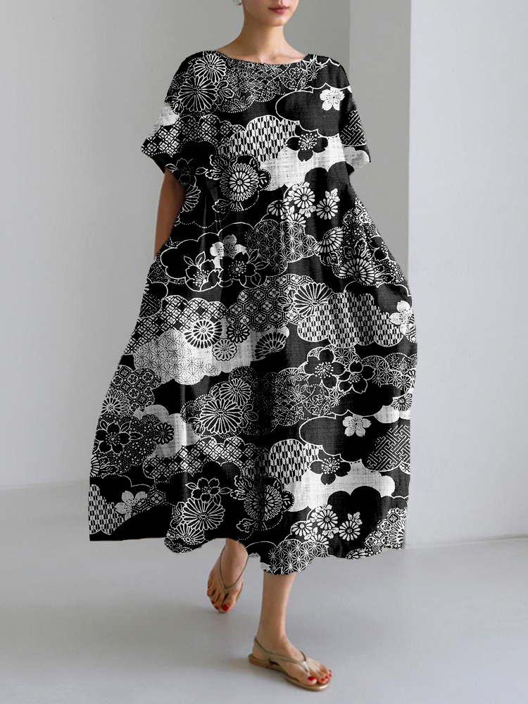 Japanese Art Flower Print Crew Neck Loose Midi Dress