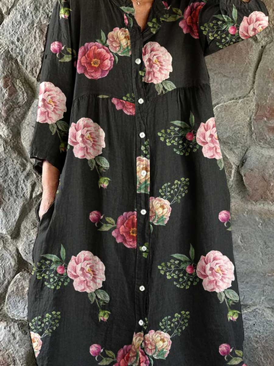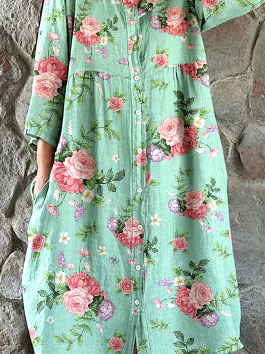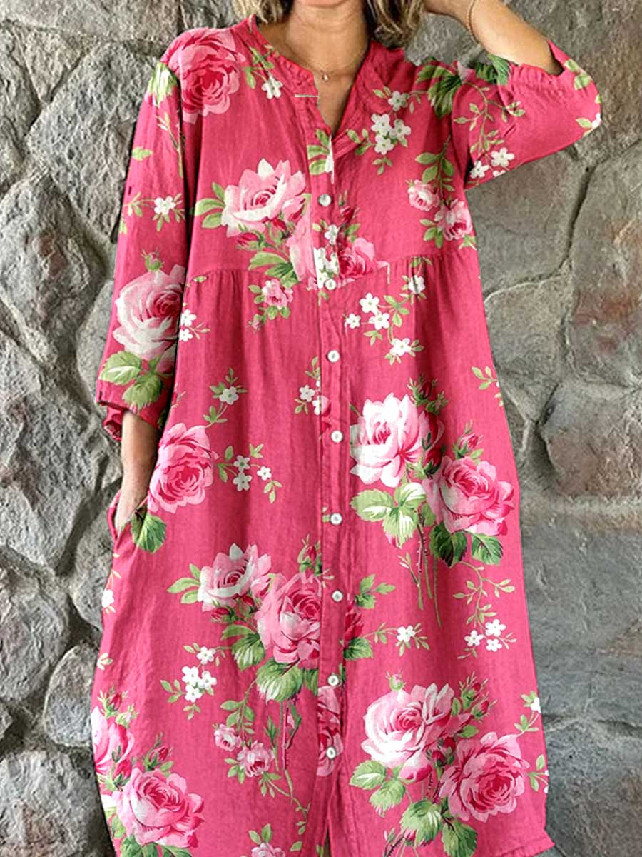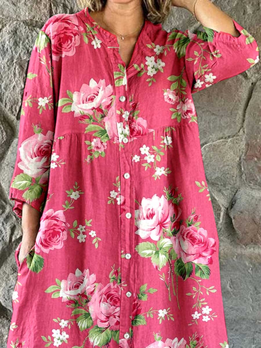 Women's Resort Art Rose Floral Pattern Cotton Shirt Dress