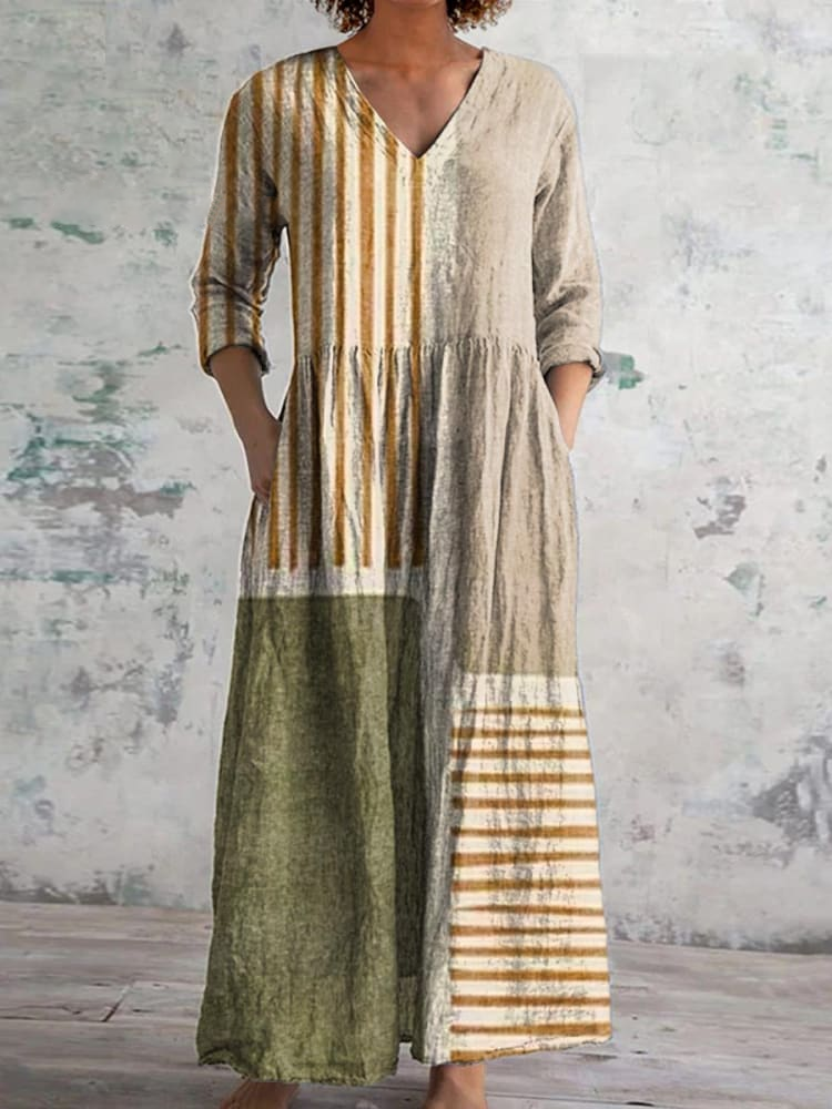 Women's Vintage Art Line Color Block Pattern Cotton And Linen Dress