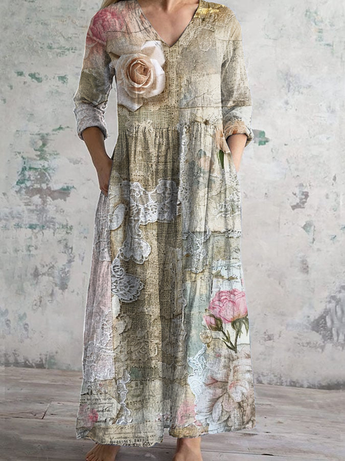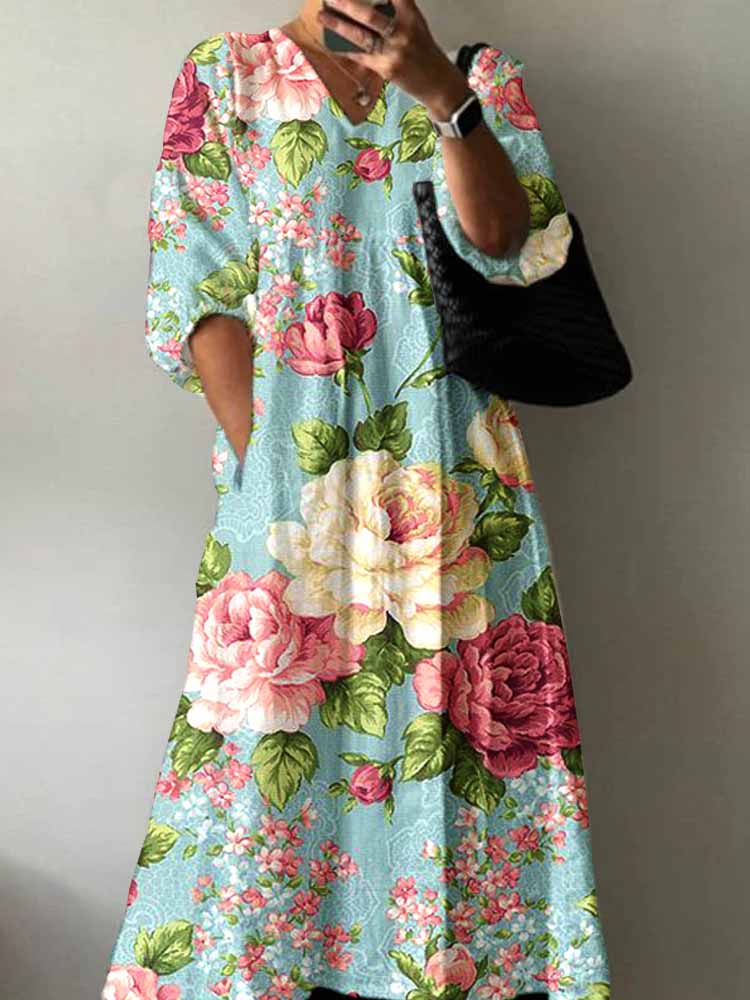 Women's V-Neck Retro Rose Floral Pattern Cotton And Linen Dress