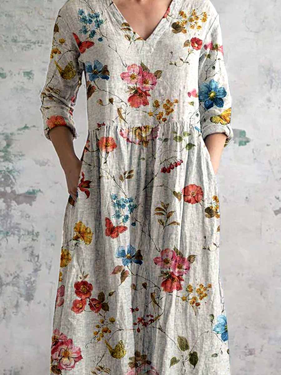 Women's V-Neck Watercolor Floral Pattern Cotton And Linen Dress