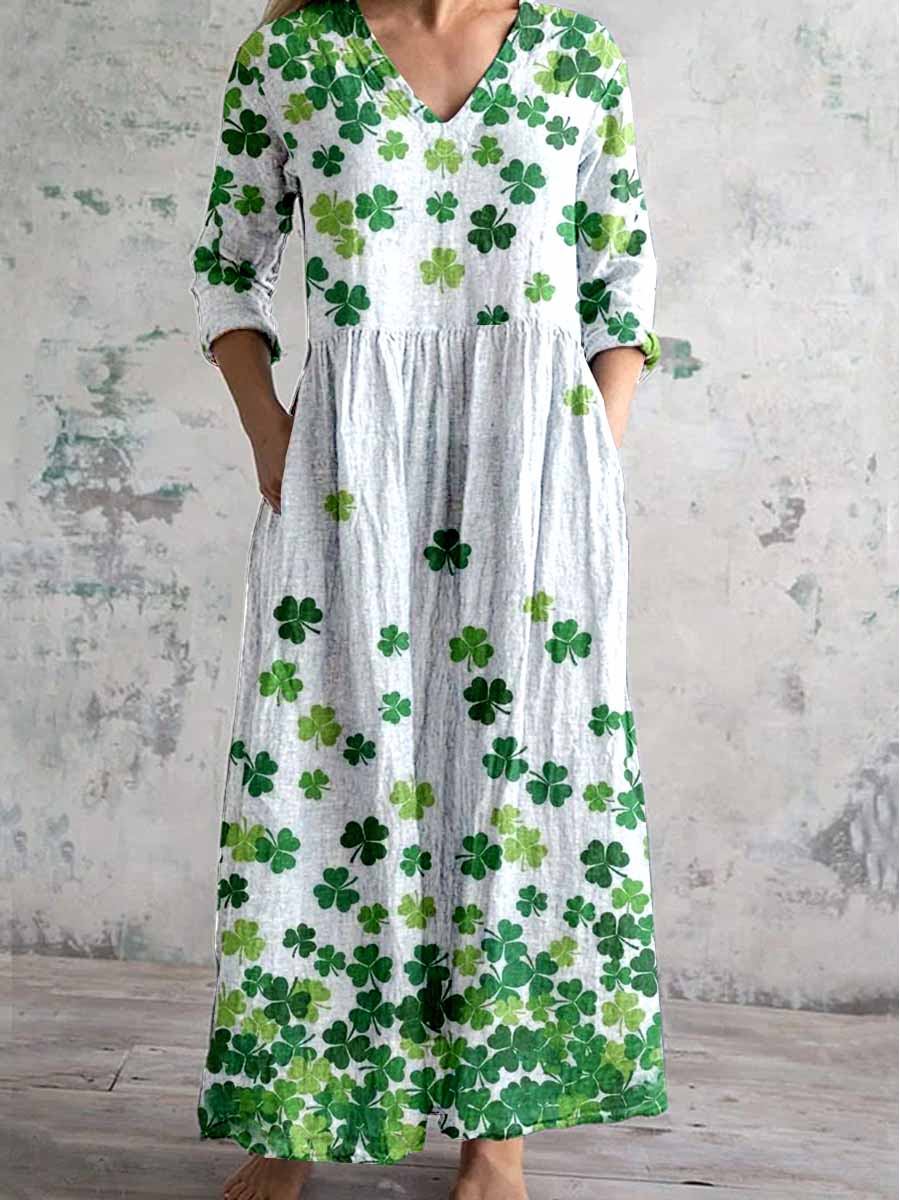 Women's V-Neck Clover PatternlPrint Pattern Cotton And Linen Dress