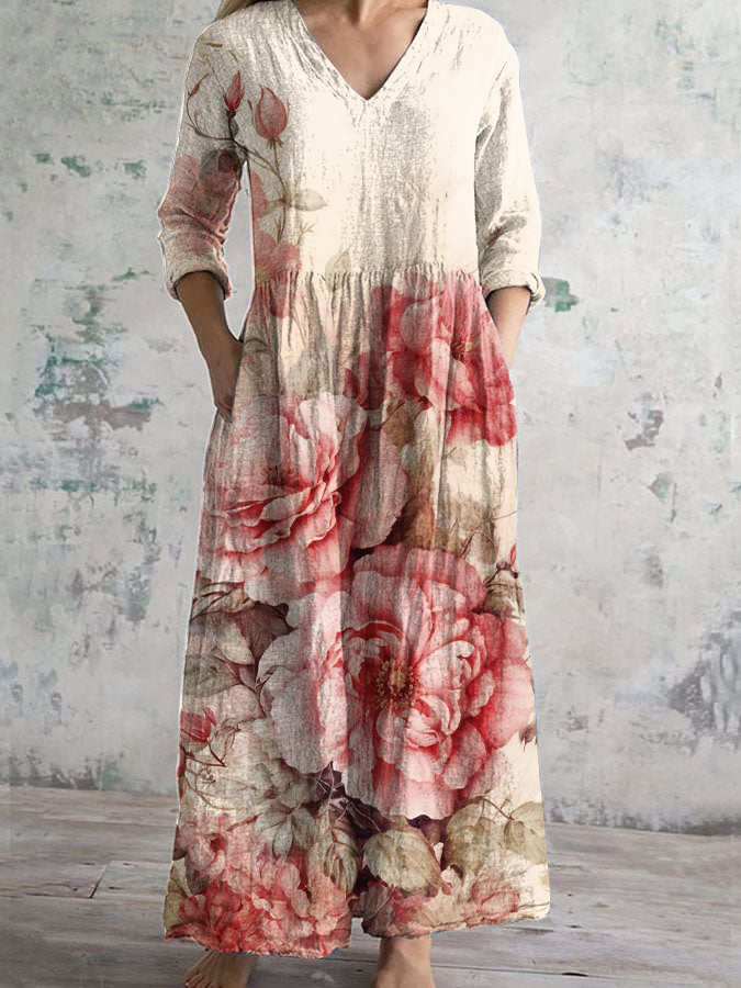 Women's V-Neck Watercolor Rose Floral Pattern Cotton And Linen Dress