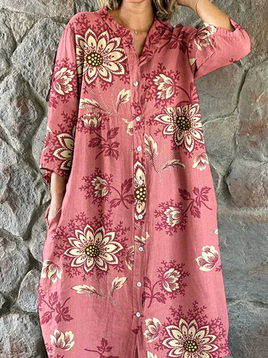 Women‘s Ethnic Floral Pattern Cotton Shirt Dress
