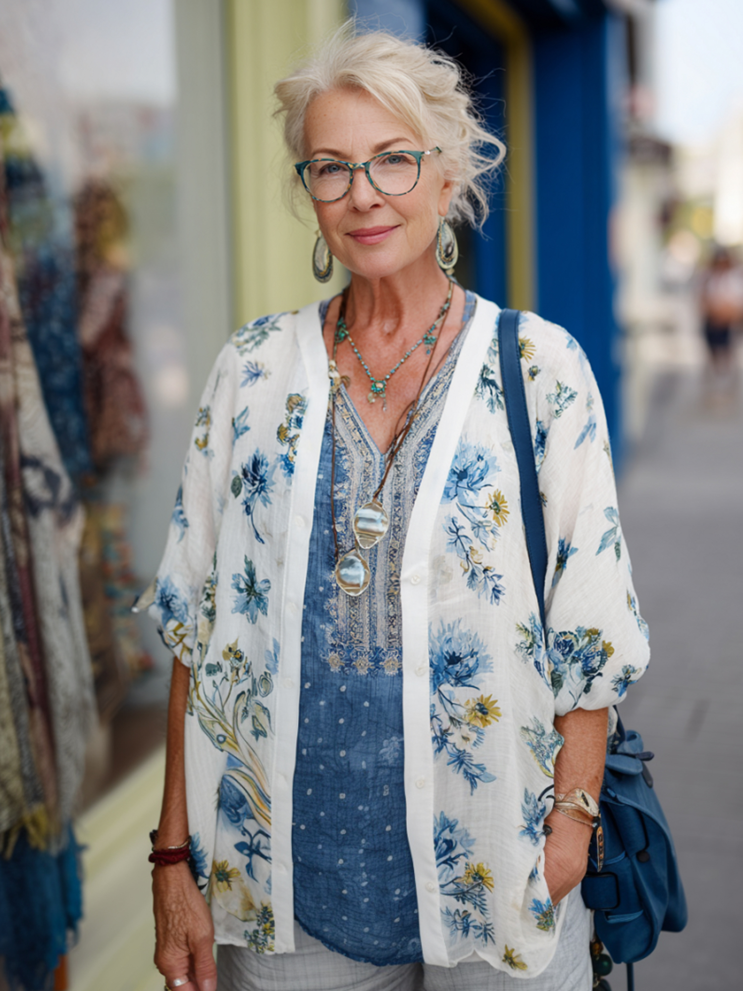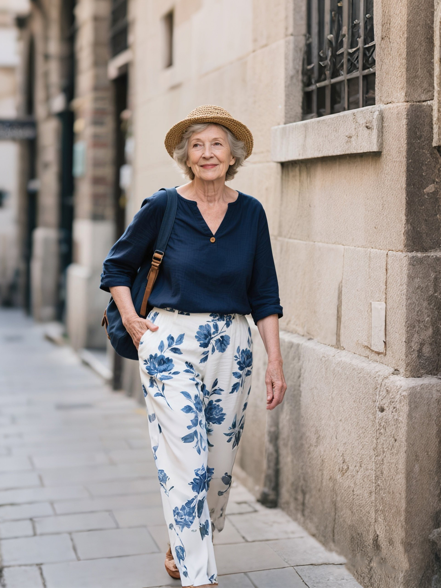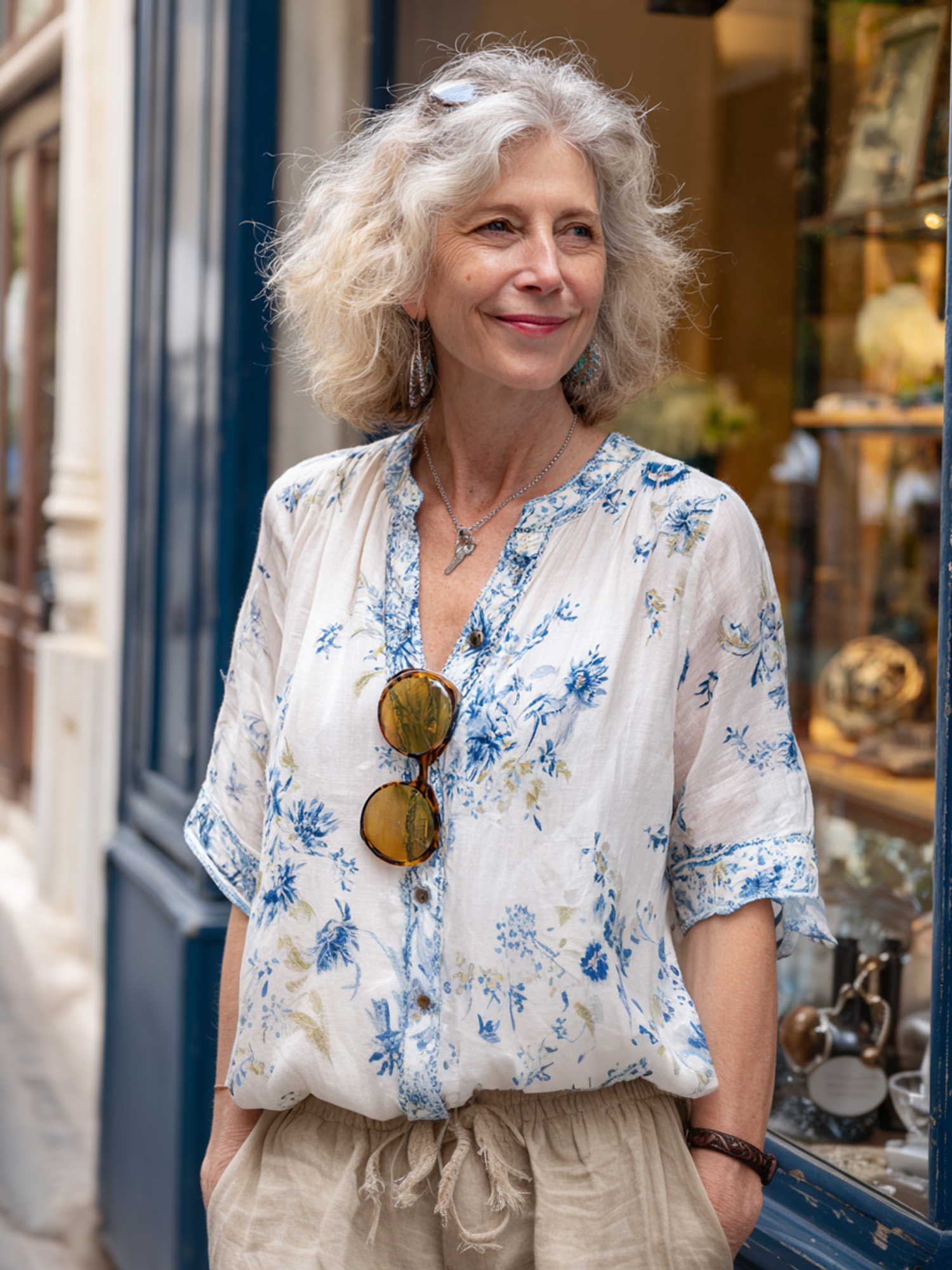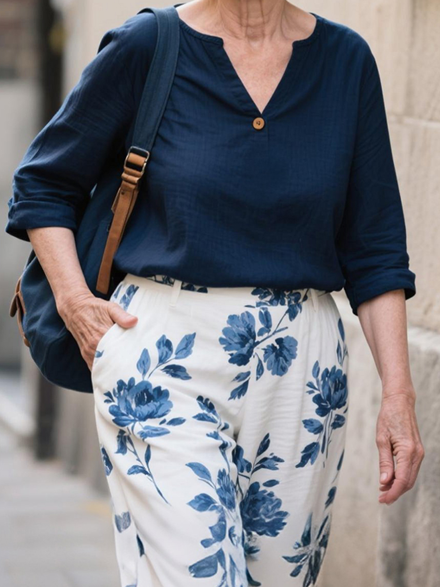 V-Neck Single Button Top + Blue White Flower Pants