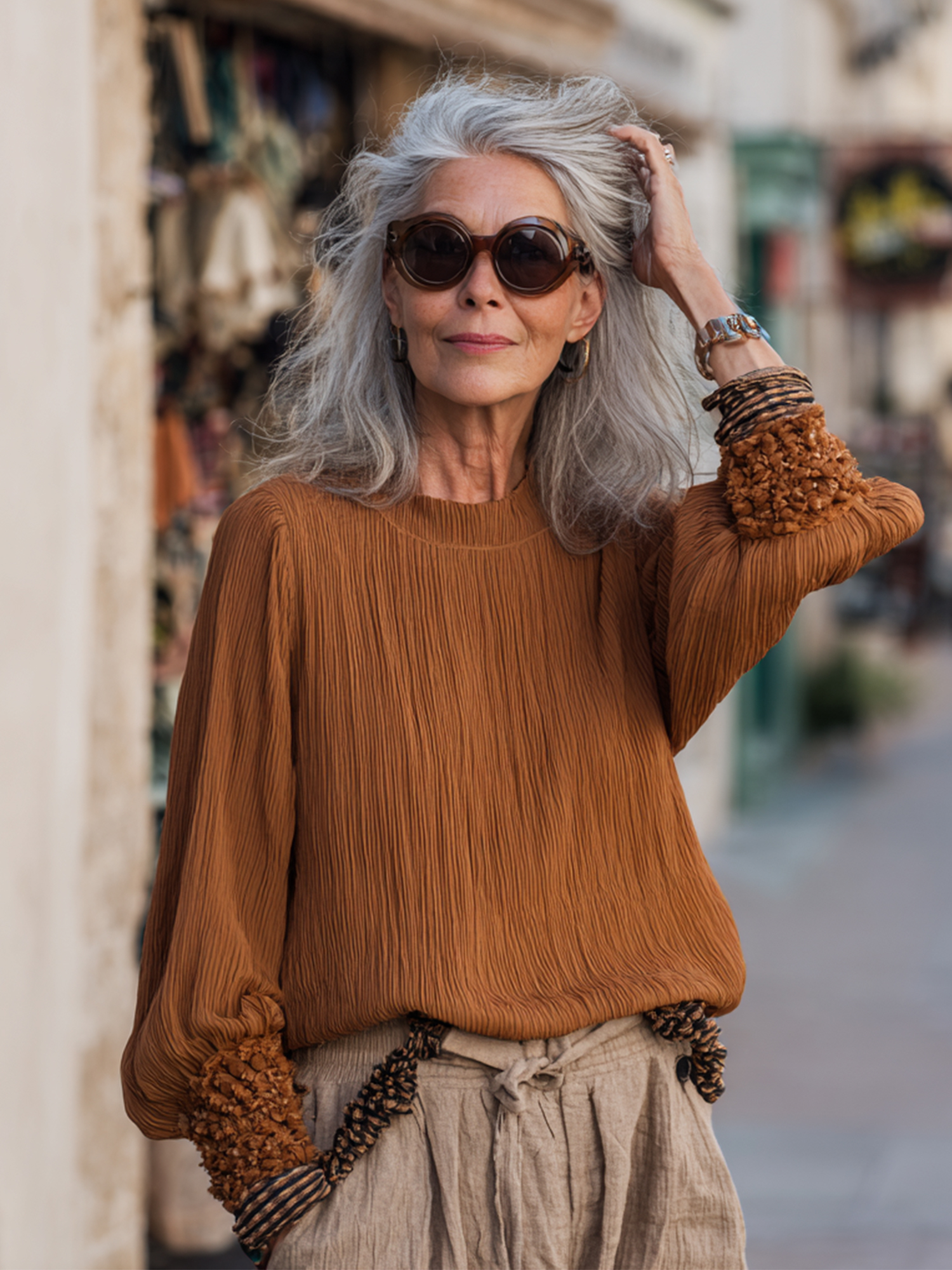 Pleated Floral Long-Sleeved Top