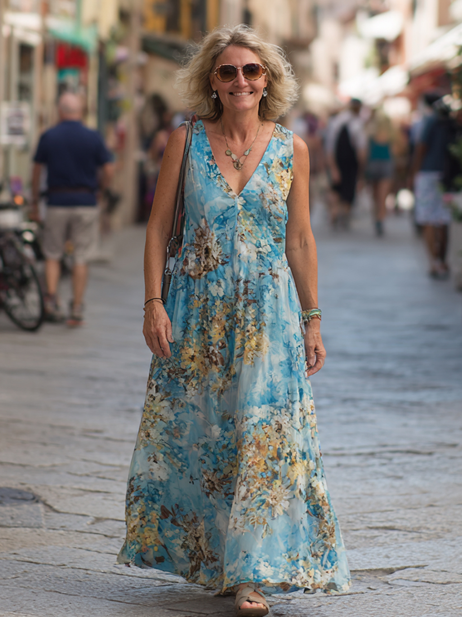 Light Blue Floral Deep - V Maxi Dress (Romantic Style)