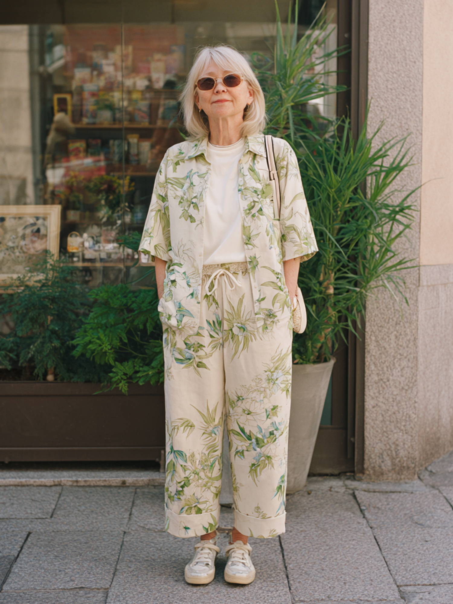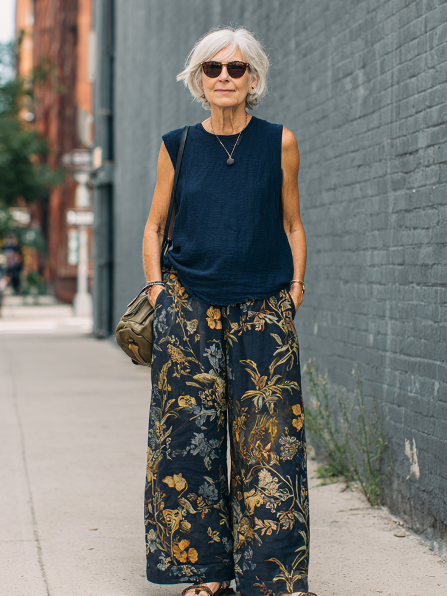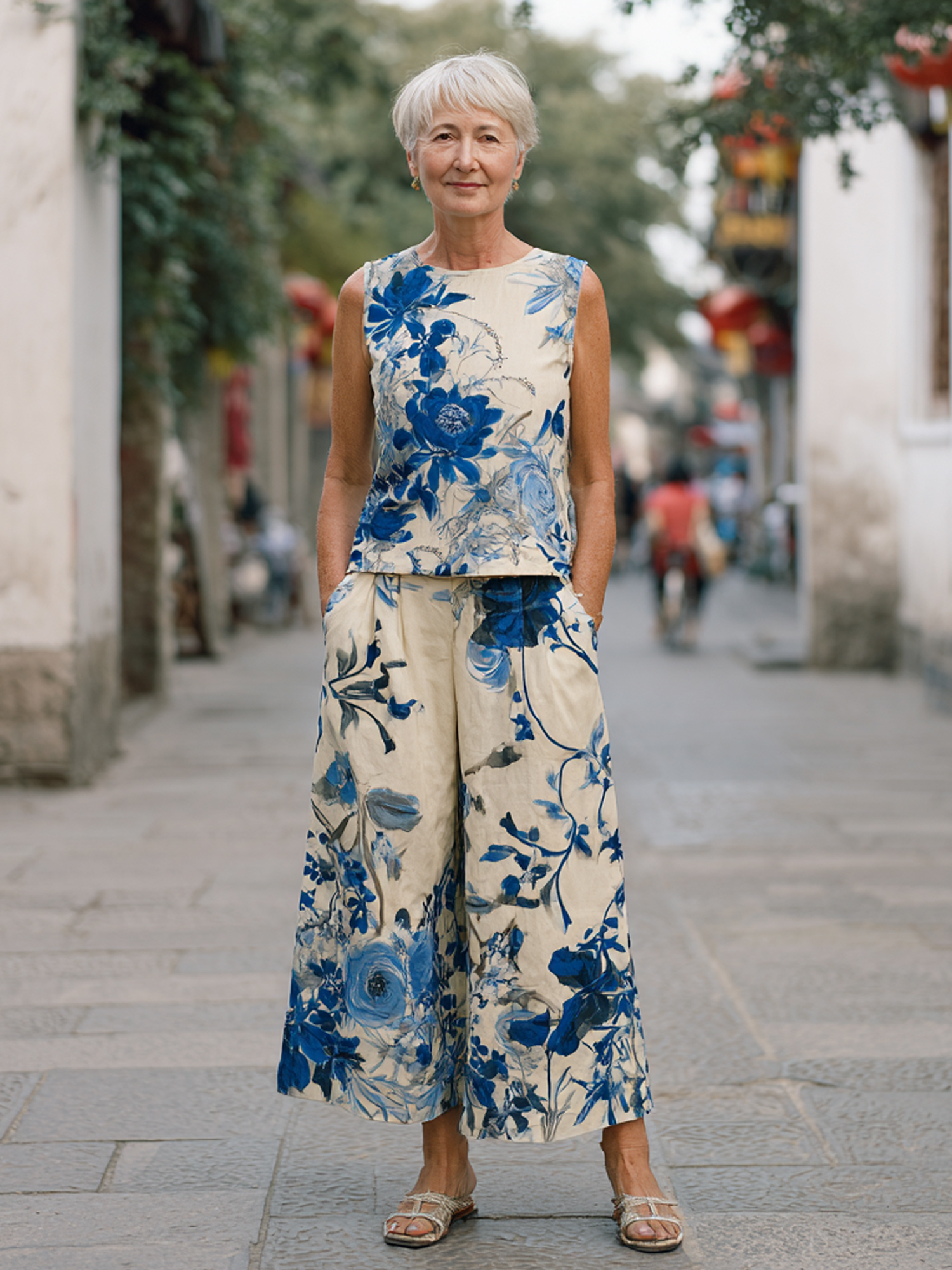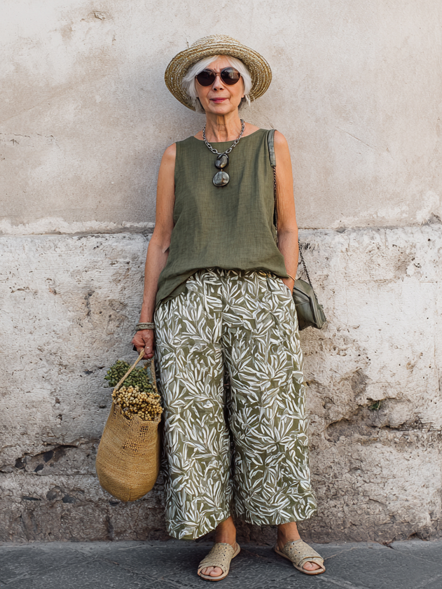 Casual Sleeveless Top + Plant Print Wide-Leg Pants