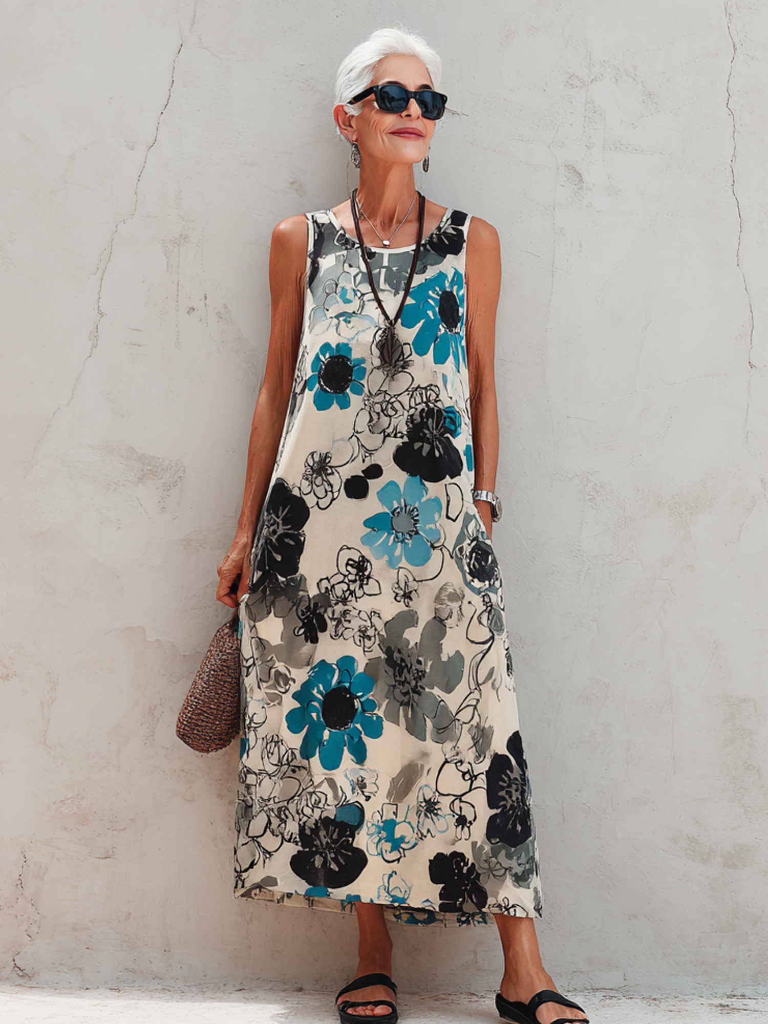 Casual blue flower sleeveless dress