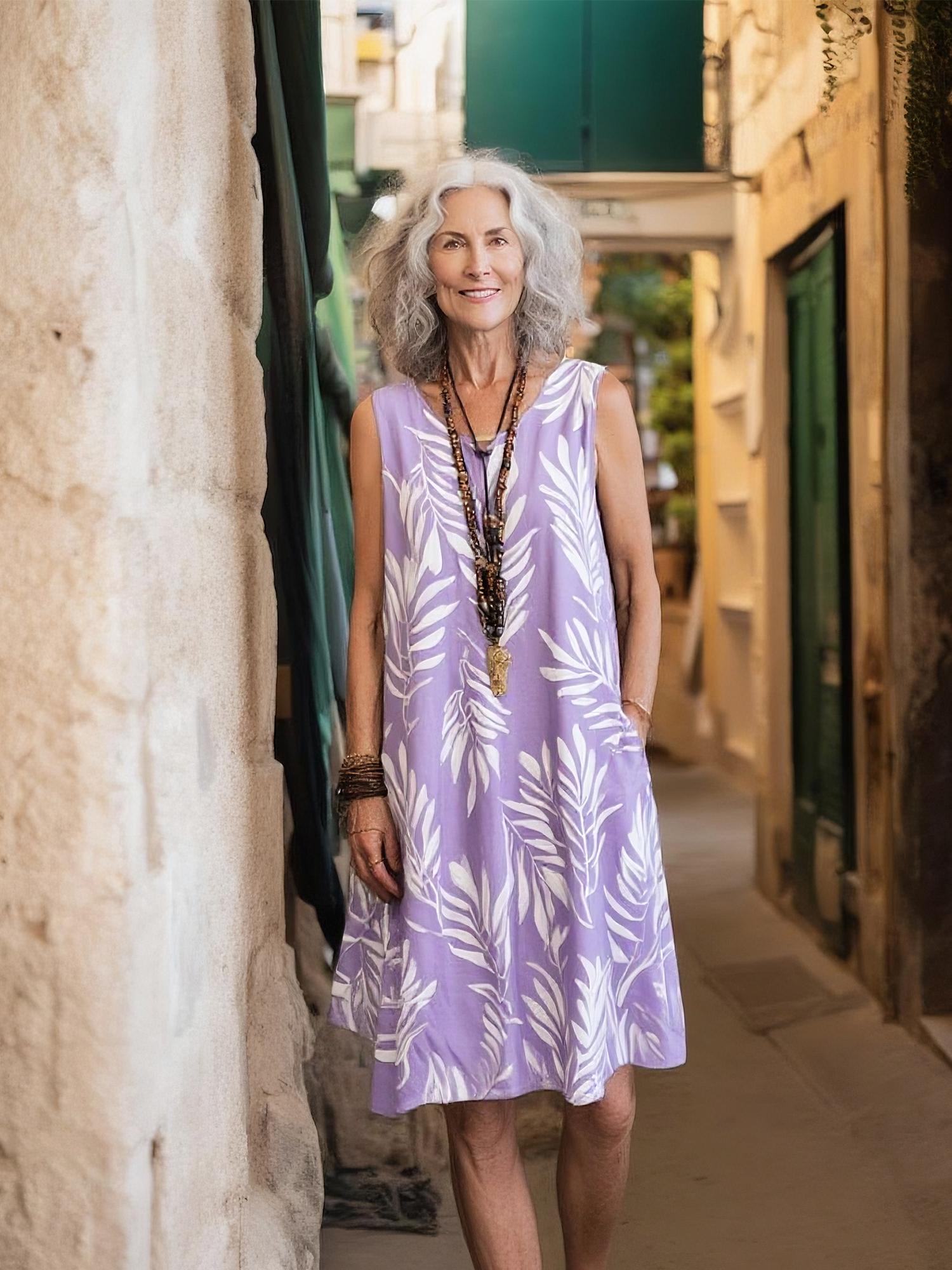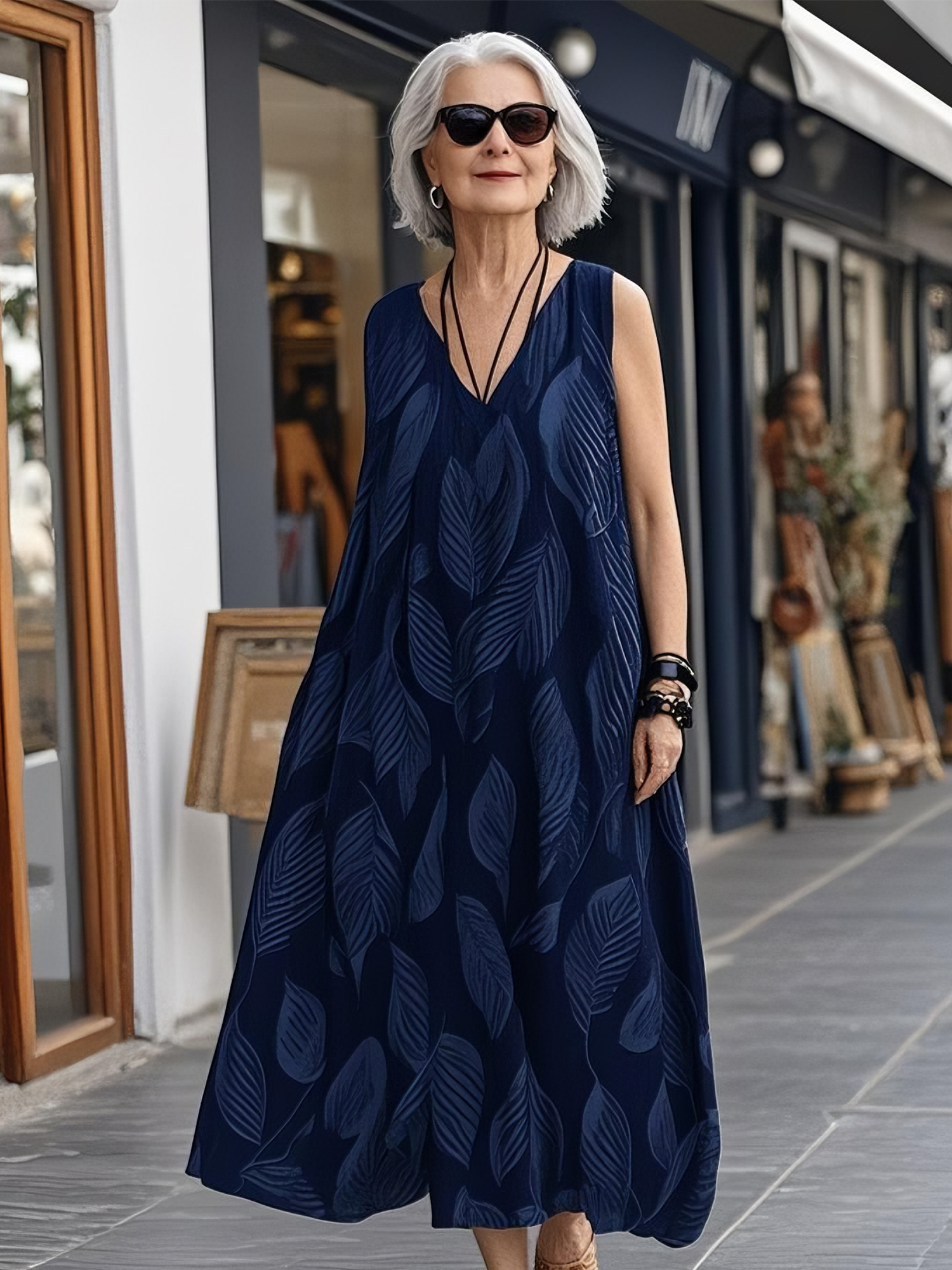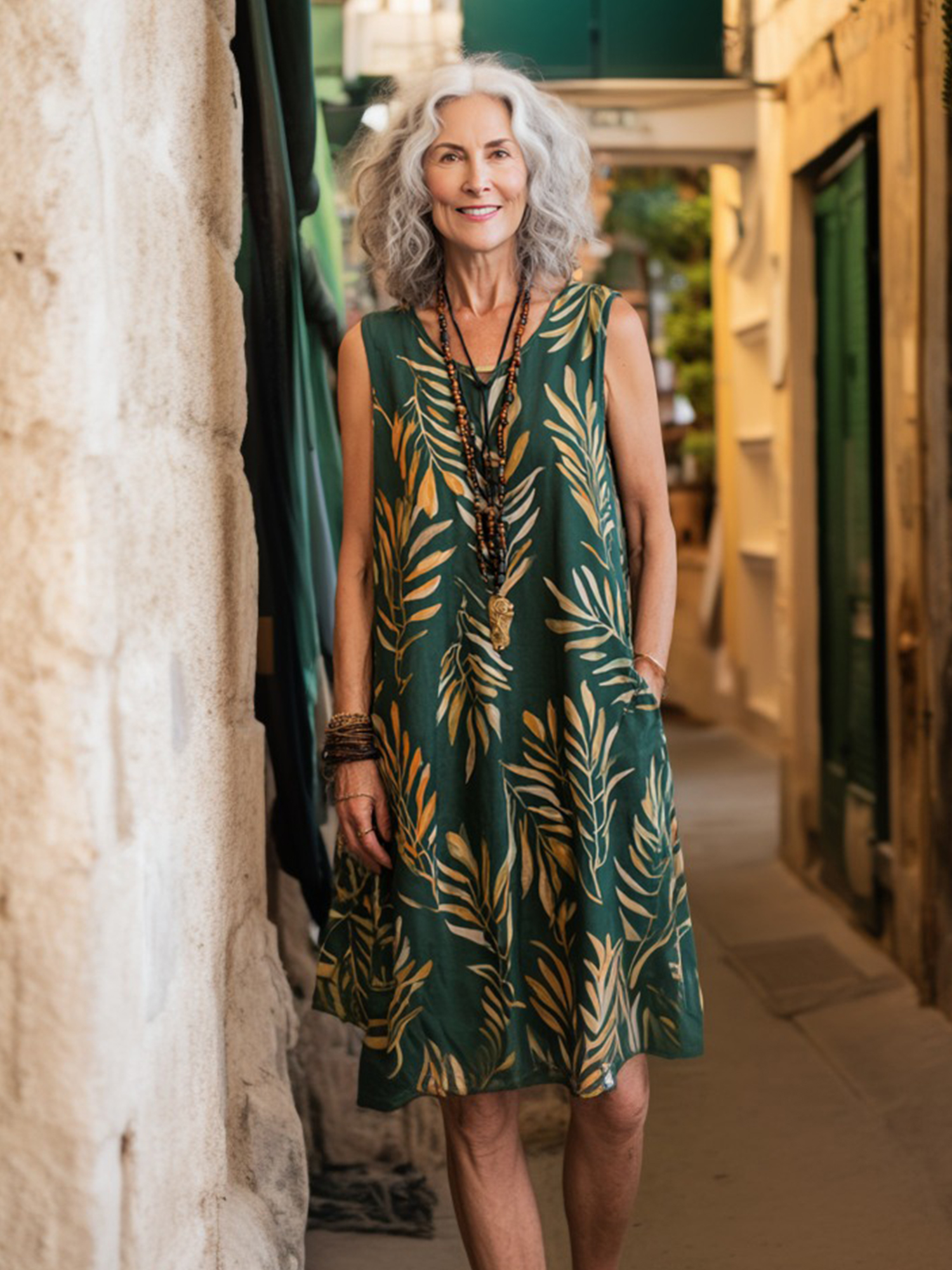 Leaf print sleeveless loose dress