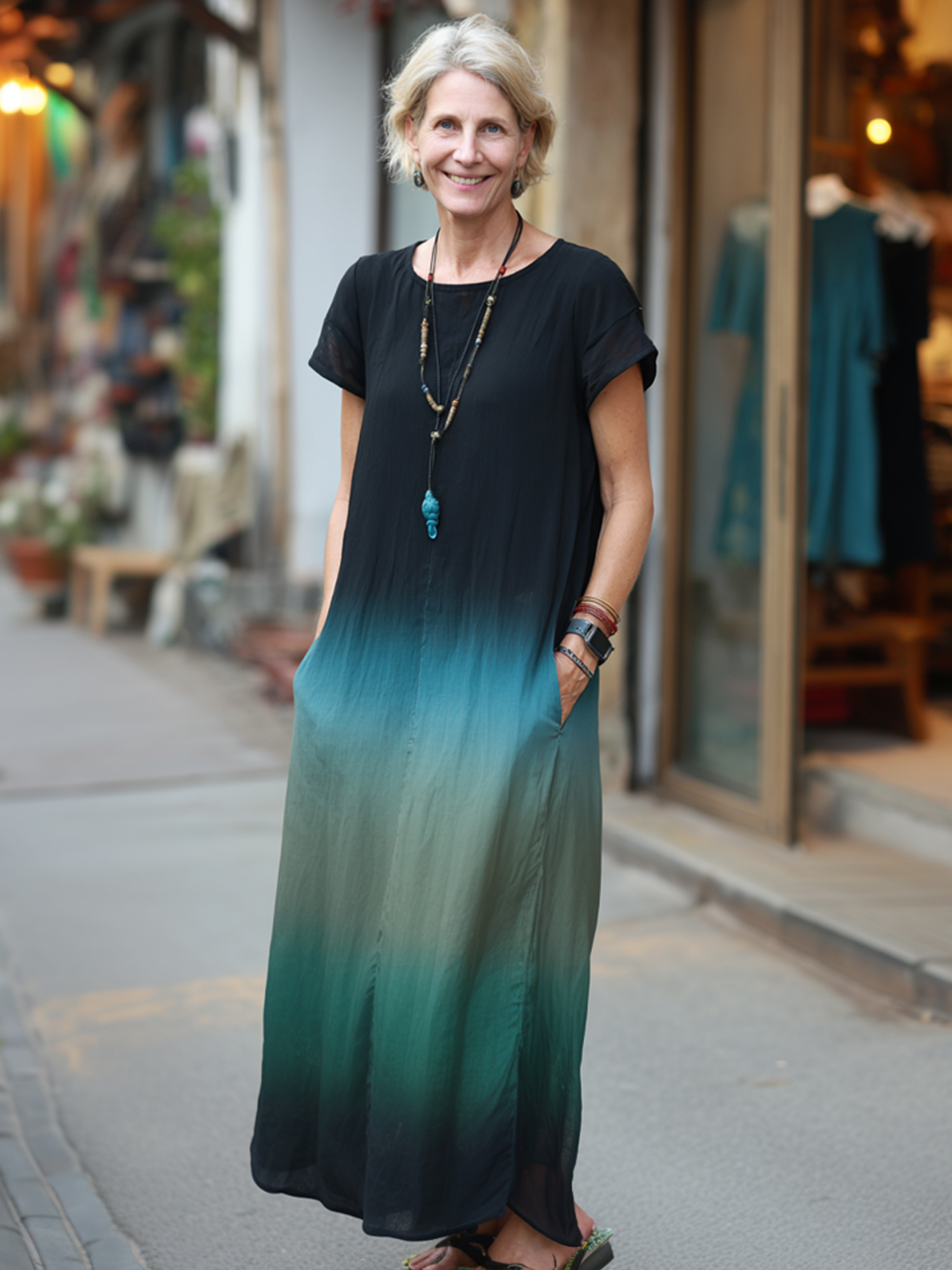 Gradient Color Short - Sleeve Maxi Dress (Artistic Style)