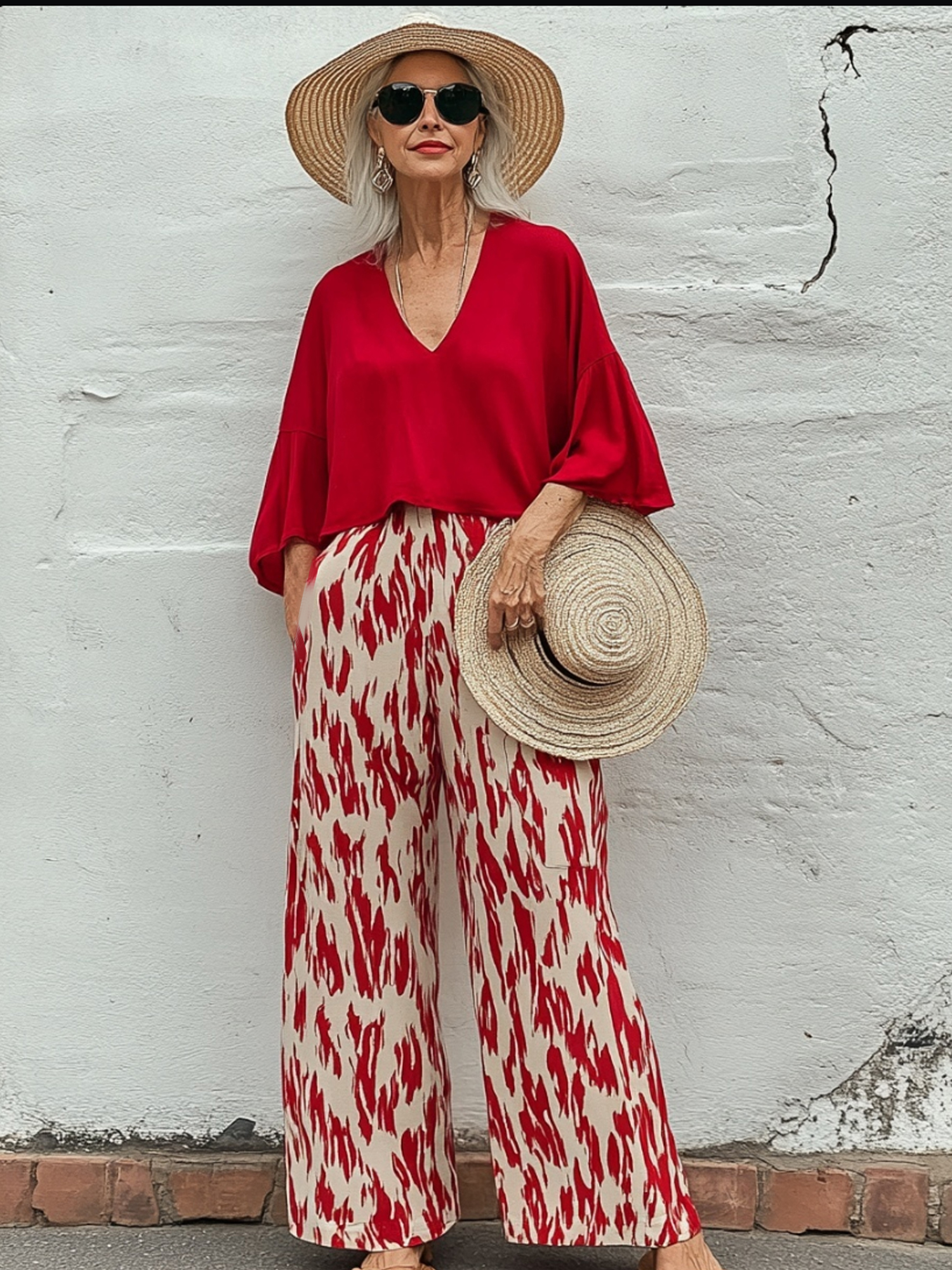 Red Cotton And linen V-Neck Loose Top + Red And White Printed Wide-Leg Pants