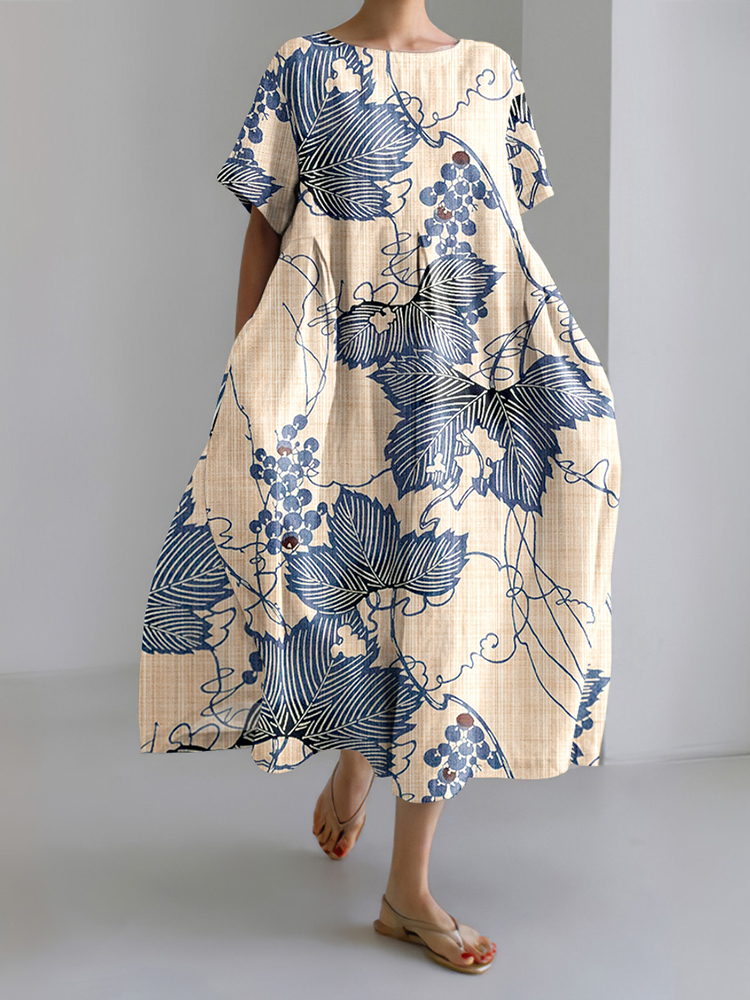 Japanese Ginkgo Biloba Pattern Linen Blend Maxi Dress