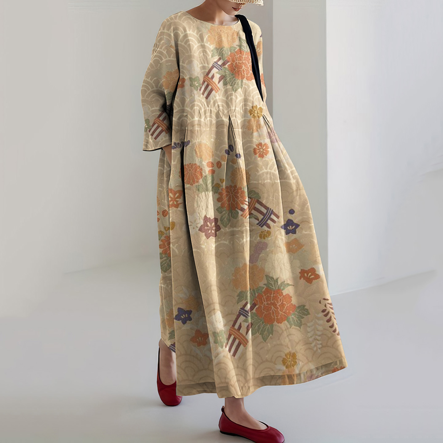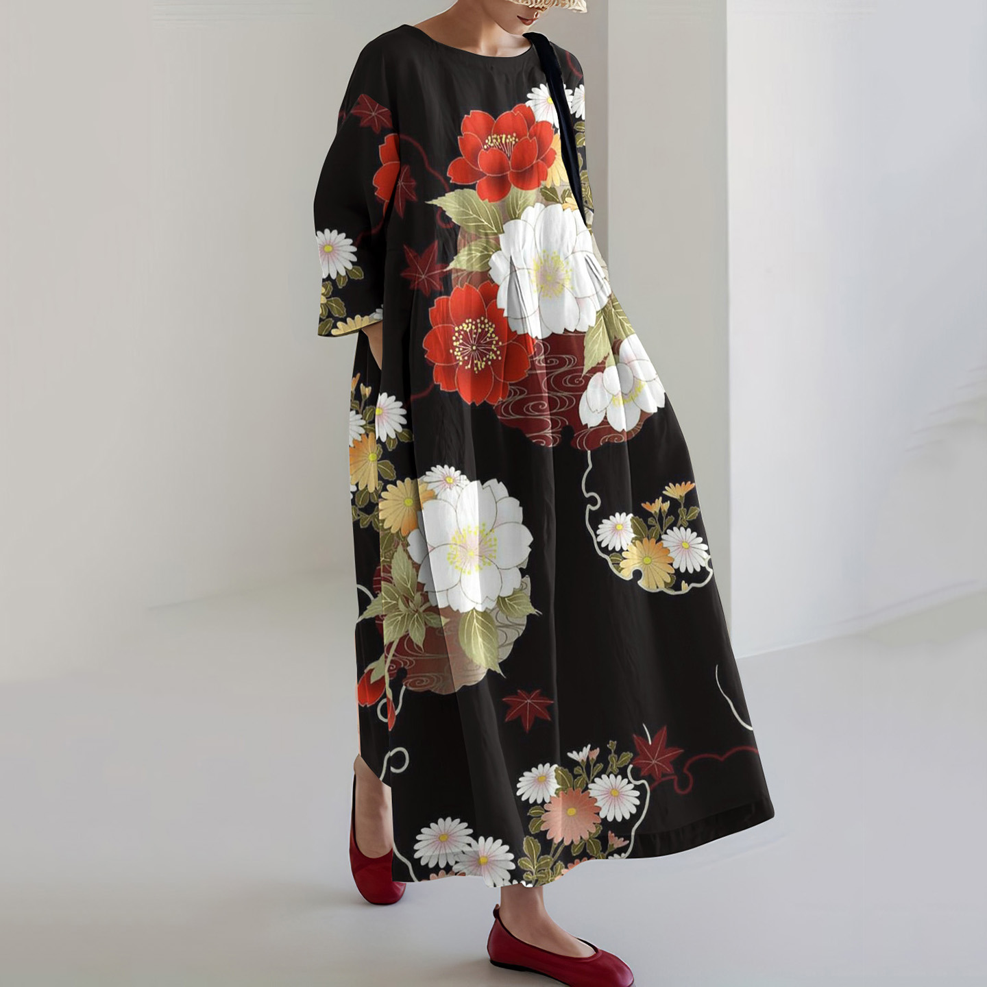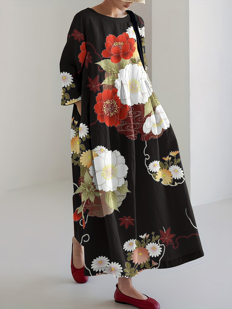 Japanese Art Flower Print Loose Midi Dress