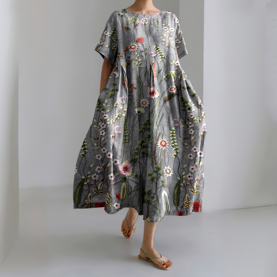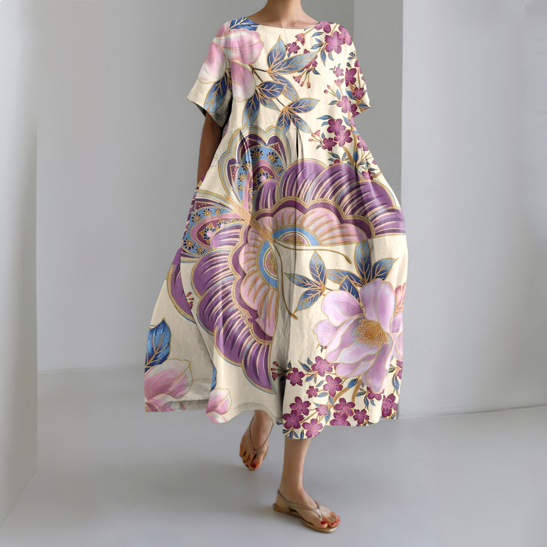 Floral Print Round Neck Loose Midi Dress