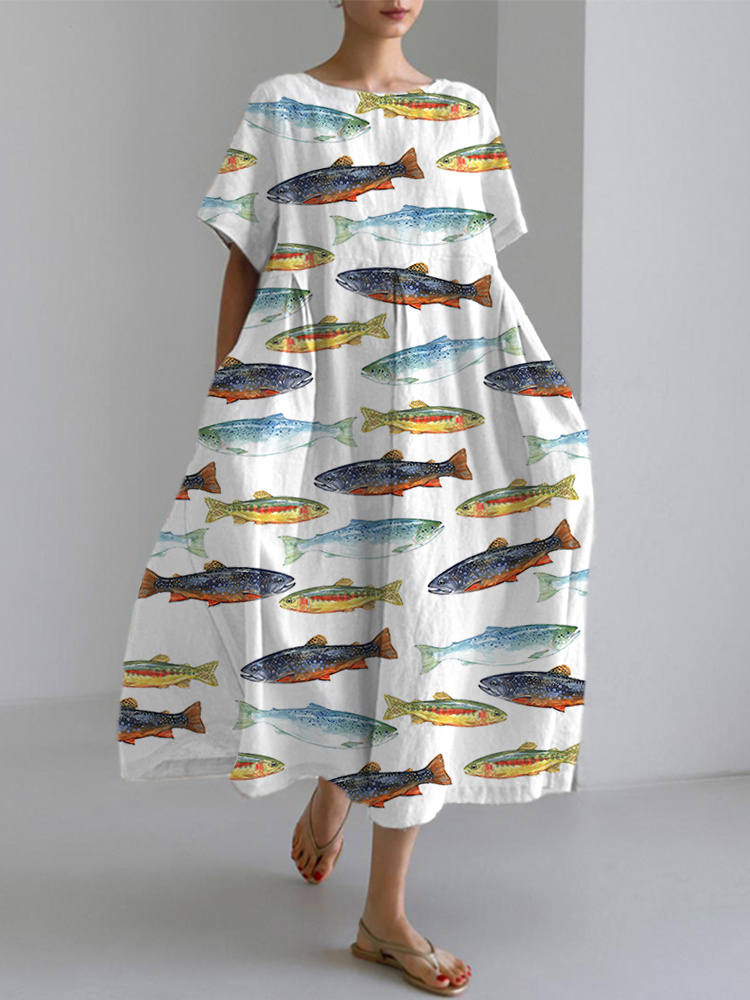 Women's Trout Watercolor Art Print Linen Blend Dress
