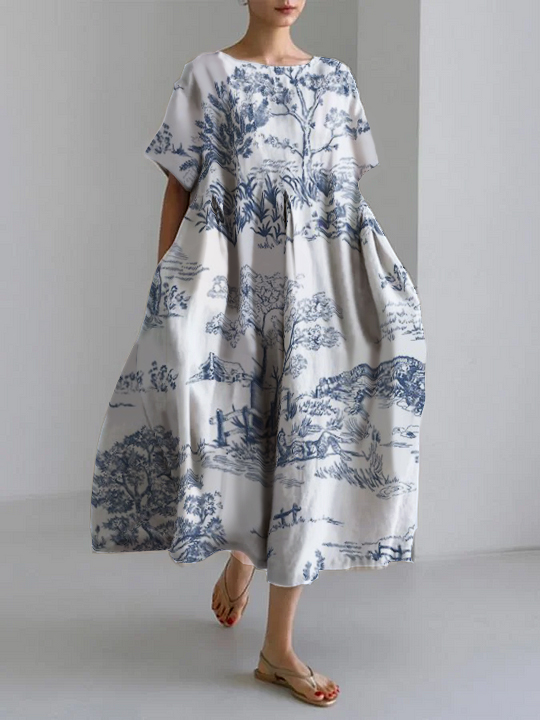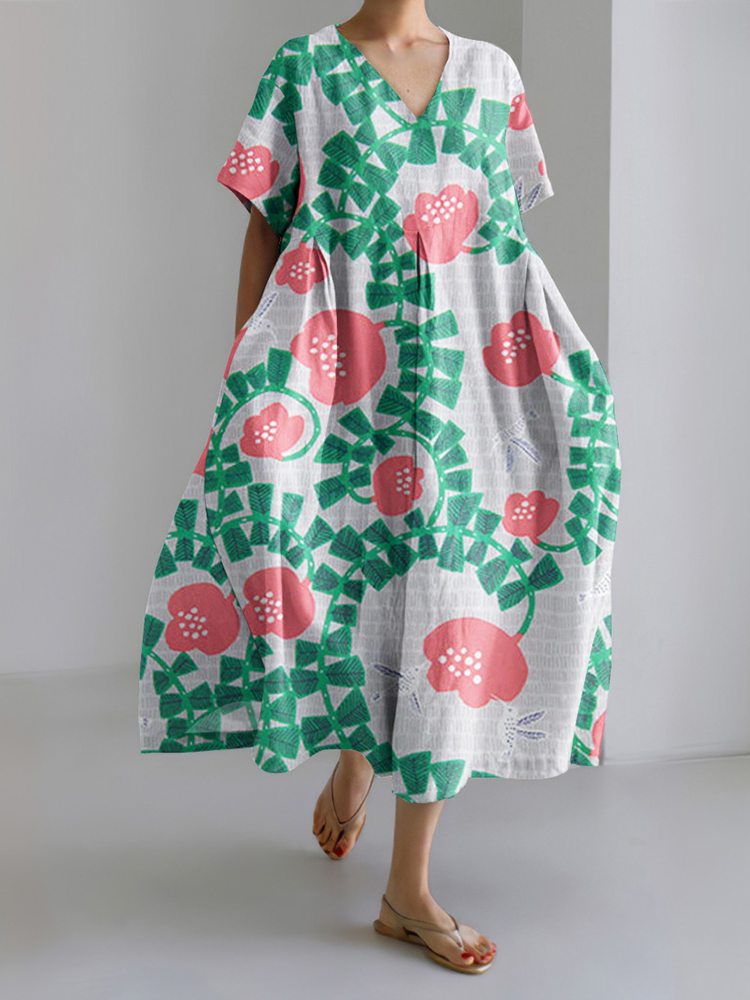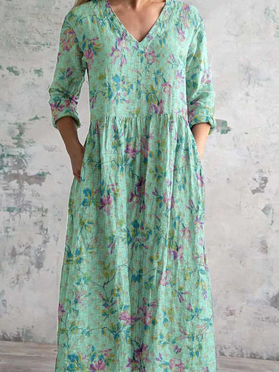 Women's Pastoral Floral Art Print Casual Cotton Linen Dress