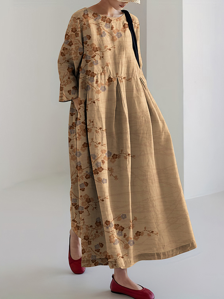 Women Japanese Art Plum Blossom Linen Blend Long Sleeve Maxi Dress