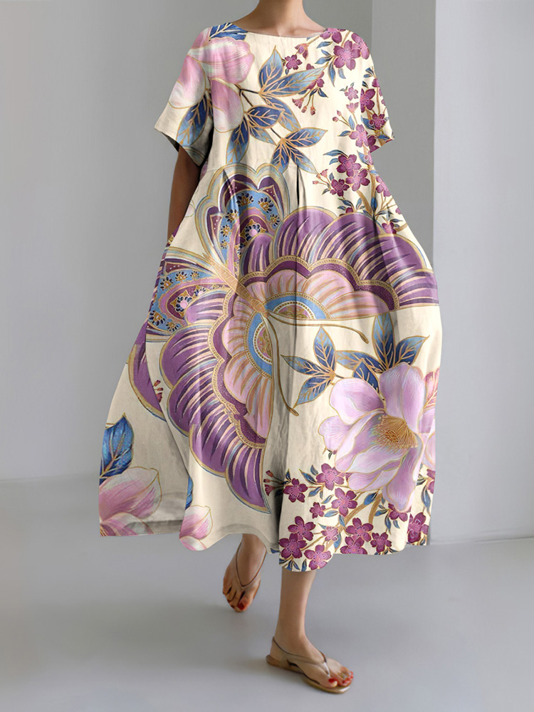 Vintage Japanese Art Flower Print Short Sleeve Casual Midi Dress
