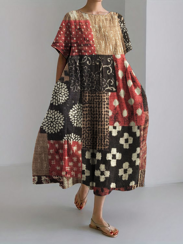 Japanese Floral Fiber Patchwork Linen Blend Maxi Dress
