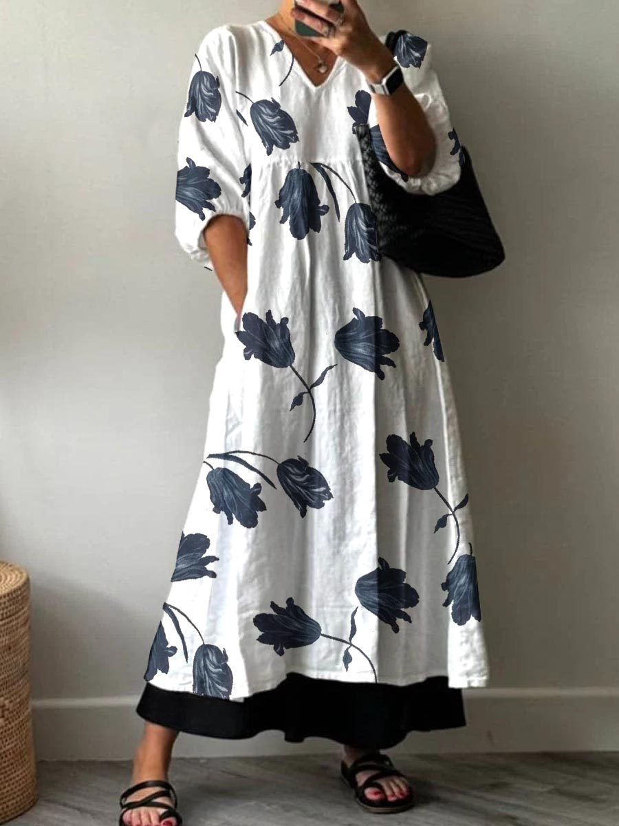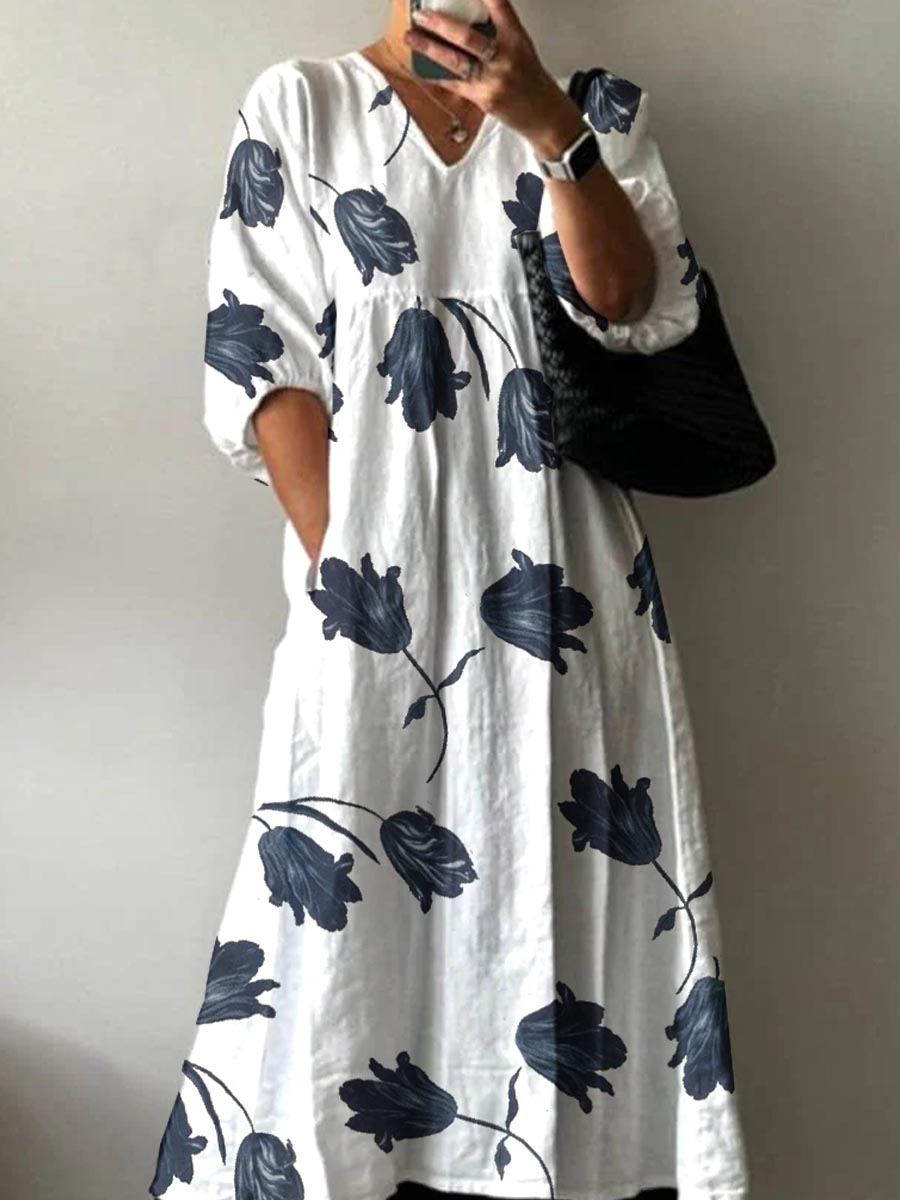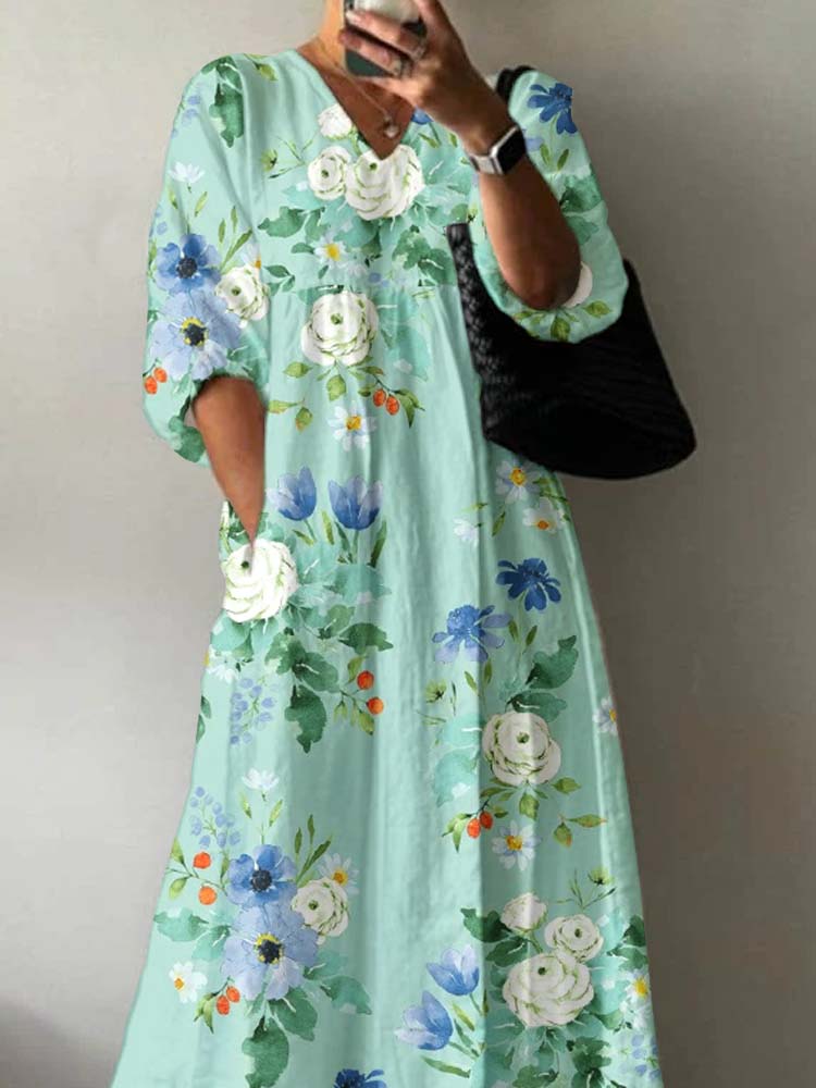 Women's Vintage Floral Art Print Casual V-Neck Pocket Cotton Dress