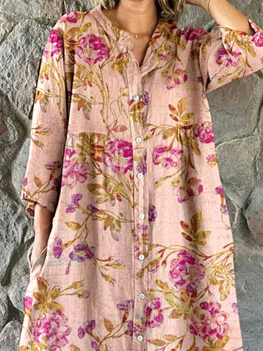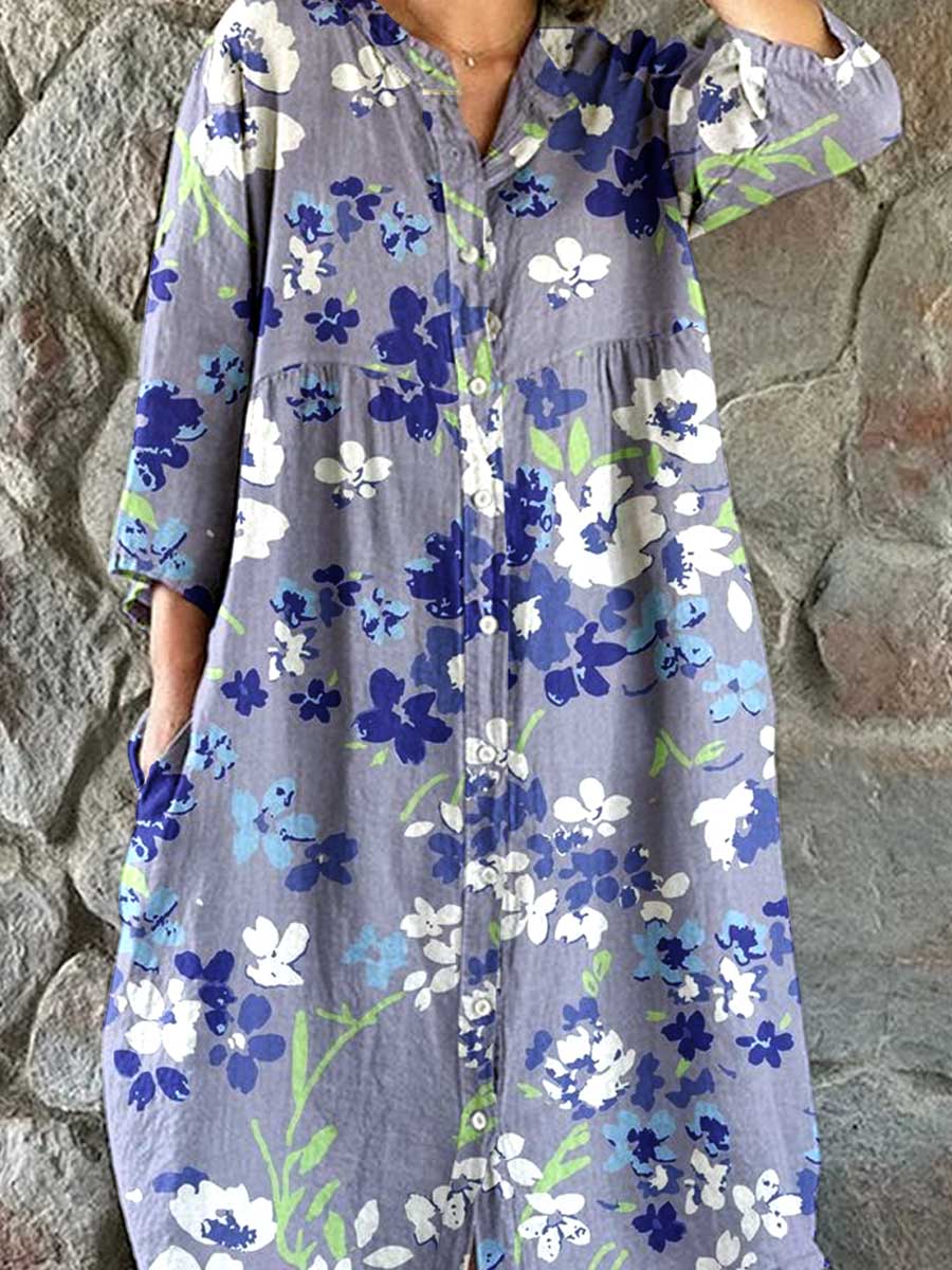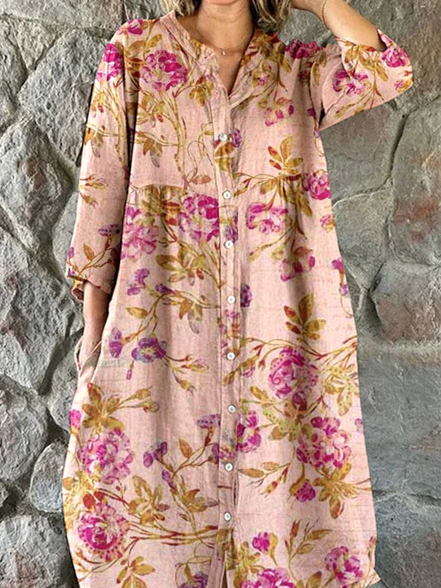 Women's Resort Art Floral Pattern Cotton Shirt Dress