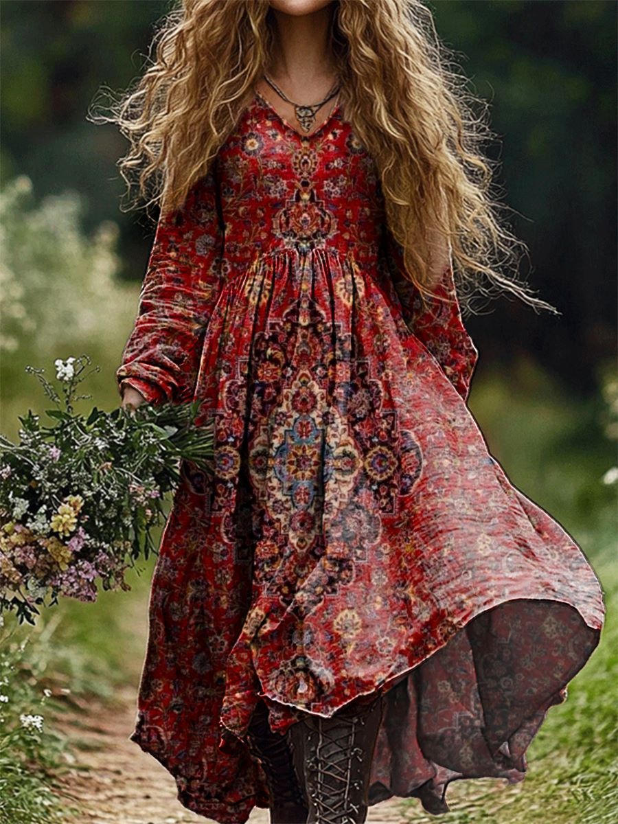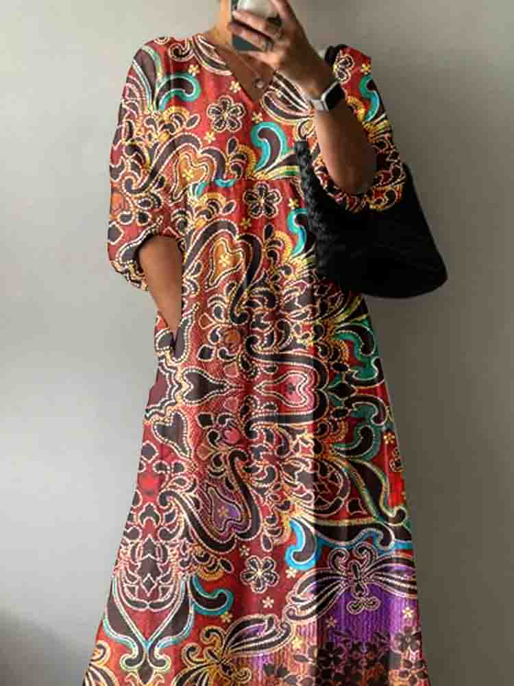 Women's Floral Vintage Ethnic Pattern Art Print V Neck Pocket Cotton Dress