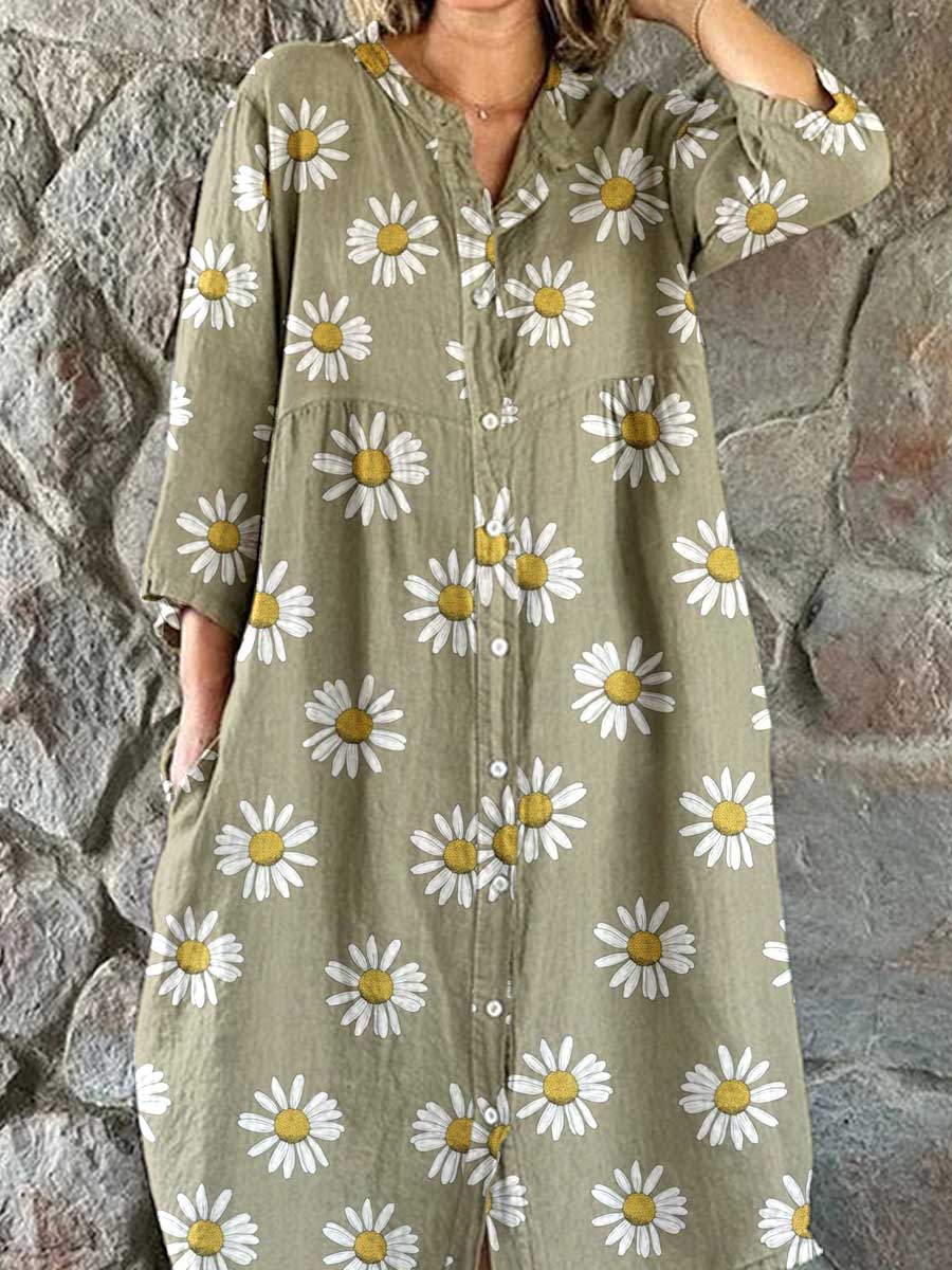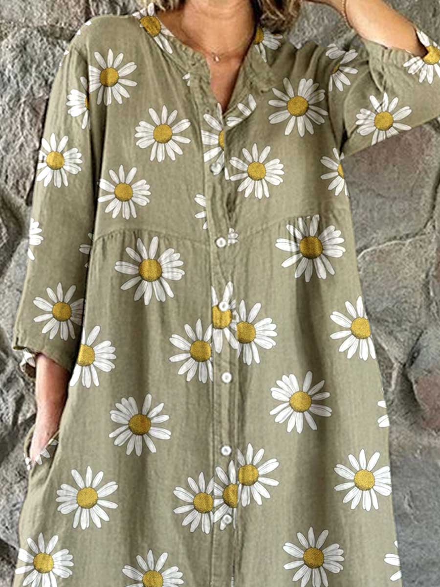 Women's Artistic chrysanthemum floral pattern Cotton Shirt Dress