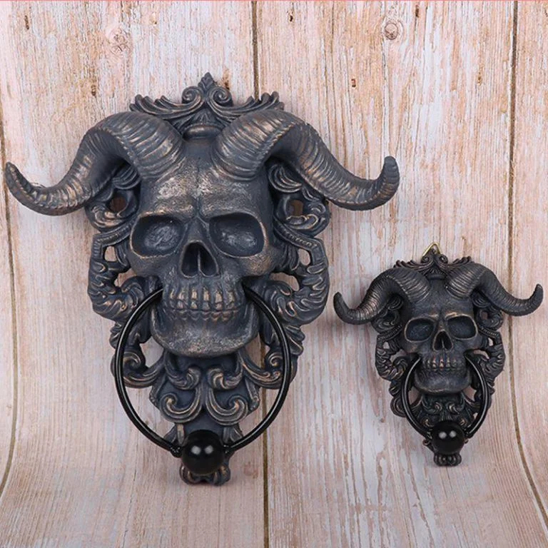 The Baphomet devil takes the form of a horned god, as represented by the sculpture. A dark, ghastly skull with large, enigmatic horns stands in front of a filigree lace background. The door knocker sculpture is terrific. There will be a breathtaking door knocker, whether indoors our outdoors.