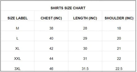 Size Chest Measurements (In Inches): S-38, M-39, L-40, XL-42, XXL-44