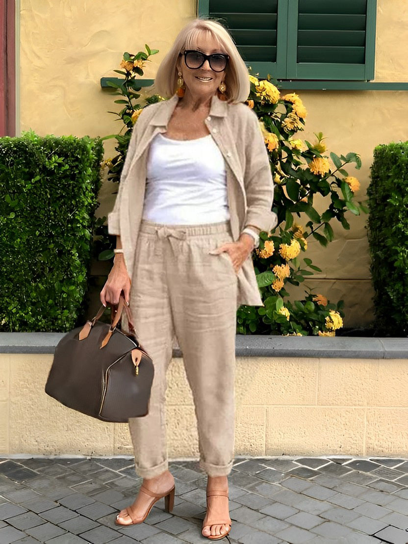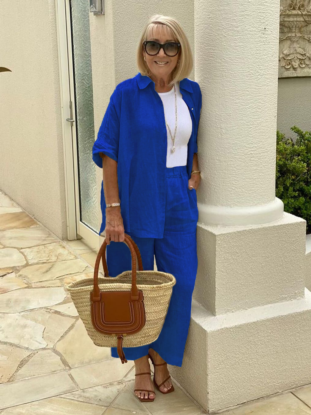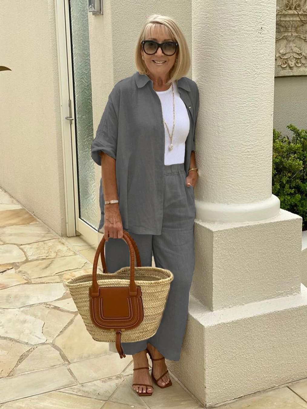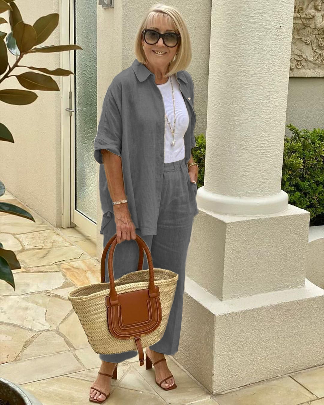 Neutral colour tones always look fabulous when you add a little WHITE. A rattan tote and tan heels complete the look with style. I have added one of my favourite NECKLACES featuring a gold anchor style chain and a gorgeous BAROQUE PEARL to elevate this chic look.⠀