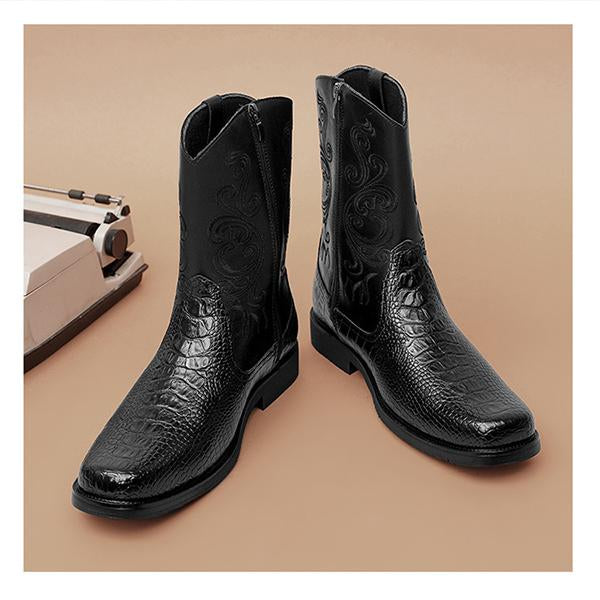 The Men's High Top Embroidery Craft Retro Western Boots combine classic Western style with artisanal craftsmanship, making them a standout addition to any collection. Constructed from high-quality leather, these boots feature intricate embroidery that adds a touch of elegance and traditional charm. The high-top design provides added ankle support, while the pointed toe and classic Western silhouette bring a vintage-inspired flair. A cushioned insole ensures all-day comfort, and the sturdy, non-slip outsole offers reliable traction on varied surfaces. Perfect for pairing with jeans or rugged wear, these boots bring a bold, timeless Western style to any outfit, making them ideal for both casual and special occasions.