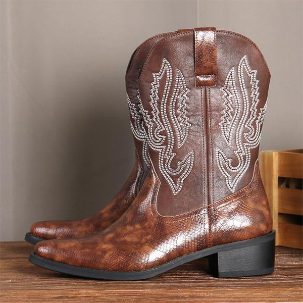 The Men's Retro Pointed Embroidered Cowboy Boots are a refined take on classic cowboy style, featuring intricate embroidery that adds elegance to a rugged design. Crafted from premium leather, these boots showcase traditional Western stitching along the shaft, capturing an authentic, vintage-inspired look. The pointed toe and angled heel enhance the classic cowboy silhouette, while a cushioned insole ensures comfort for long wear. Built with a durable, non-slip outsole, these boots provide stability and traction, making them as practical as they are stylish. Ideal for pairing with jeans or Western attire, these boots bring timeless Western charm to any wardrobe.