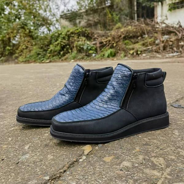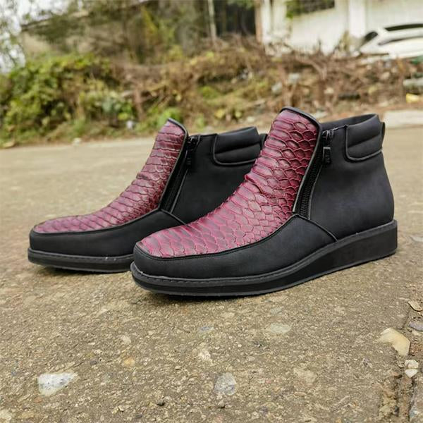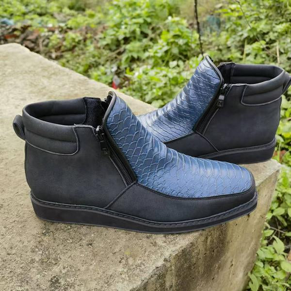 The Men's Retro Square Toe Side Zipper Ankle Boots offer a perfect fusion of vintage charm and modern convenience. Featuring a distinctive square toe design, these boots stand out with their bold and sophisticated silhouette, ideal for those who appreciate classic aesthetics with a contemporary twist. Crafted from premium leather, The crocodile pattern design showcases your wildness and confidence, which complements a variety of outfits, from casual to smart-casual ensembles. The side zipper ensures easy wear while maintaining a sleek appearance, and the ankle-high cut provides both style and flexibility. A sturdy, non-slip sole and cushioned insole add practicality and comfort, making these boots suitable for all-day wear. Perfect for both everyday wear and special occasions, these retro-inspired ankle boots are a versatile addition to any wardrobe.