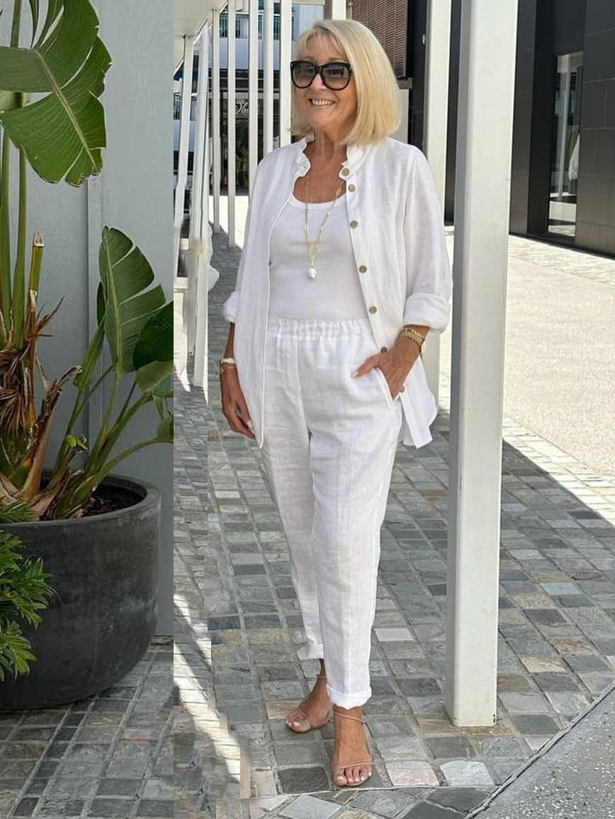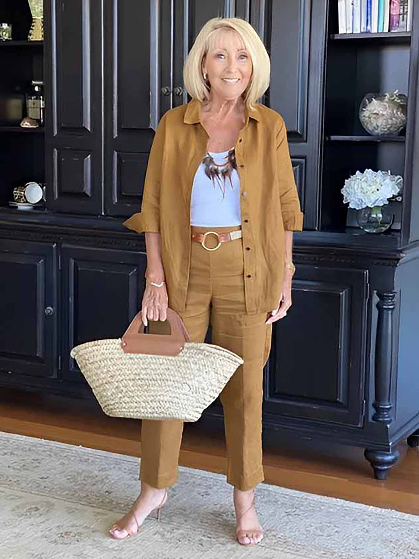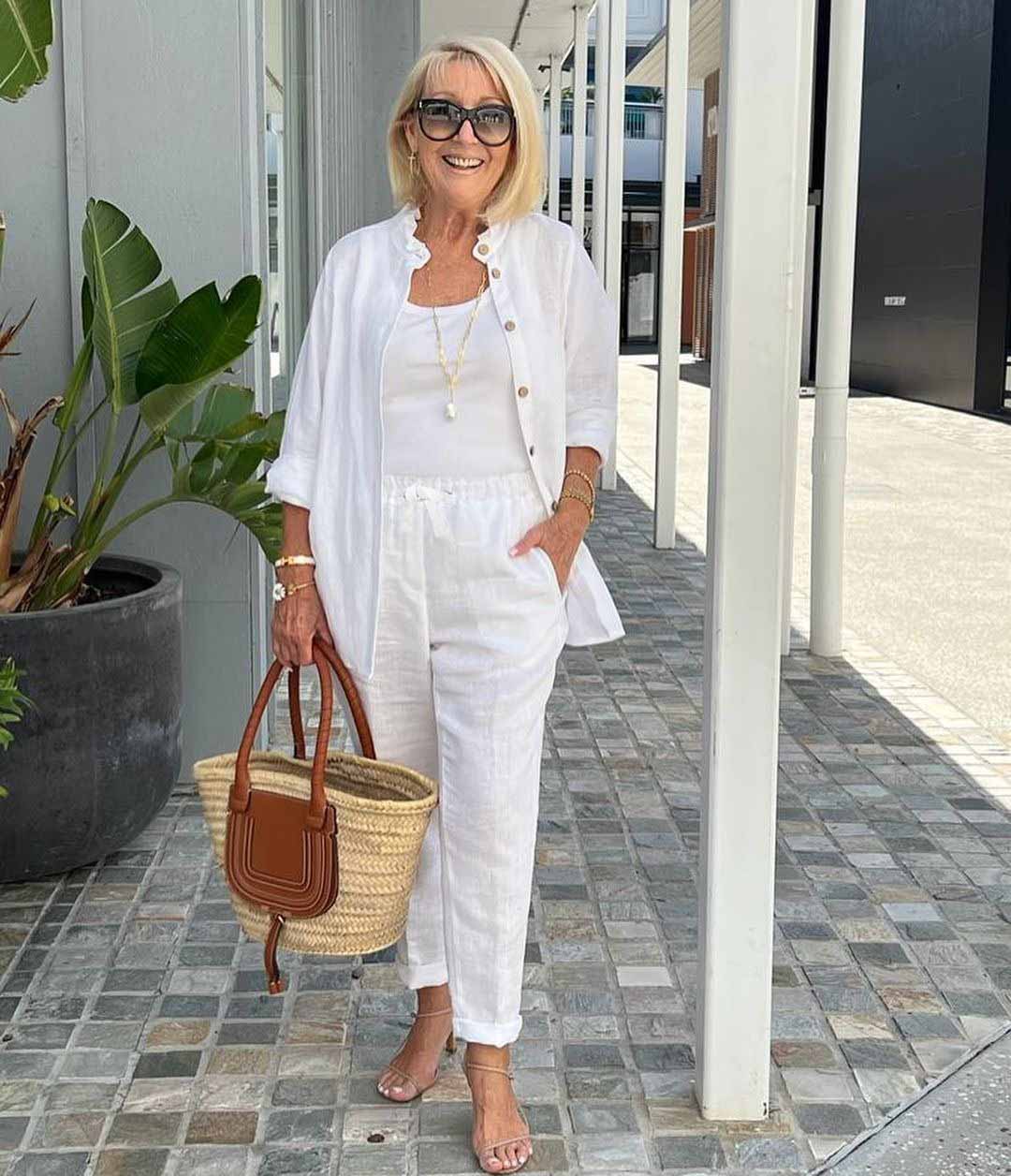 Neutral colour tones always look fabulous when you add a little WHITE. A rattan tote and tan heels complete the look with style. I have added one of my favourite NECKLACES featuring a gold anchor style chain and a gorgeous BAROQUE PEARL to elevate this chic look.⠀