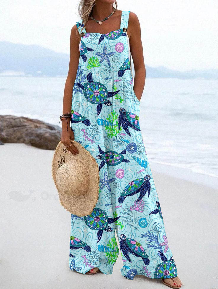 Women's Holiday Style Turtle Pattern Loose Linen Material Jumpsuits