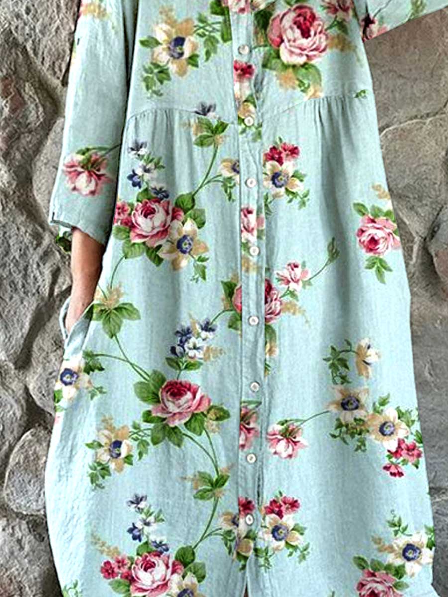 Women's Resort Art Rose Floral Cotton Shirt Dress