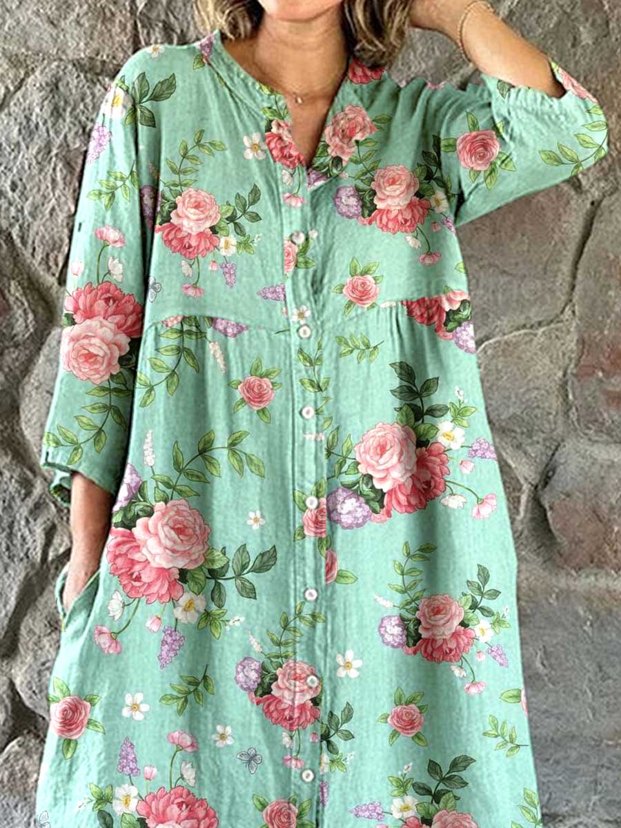 Women's Resort Art Rose Floral Cotton Shirt Dress