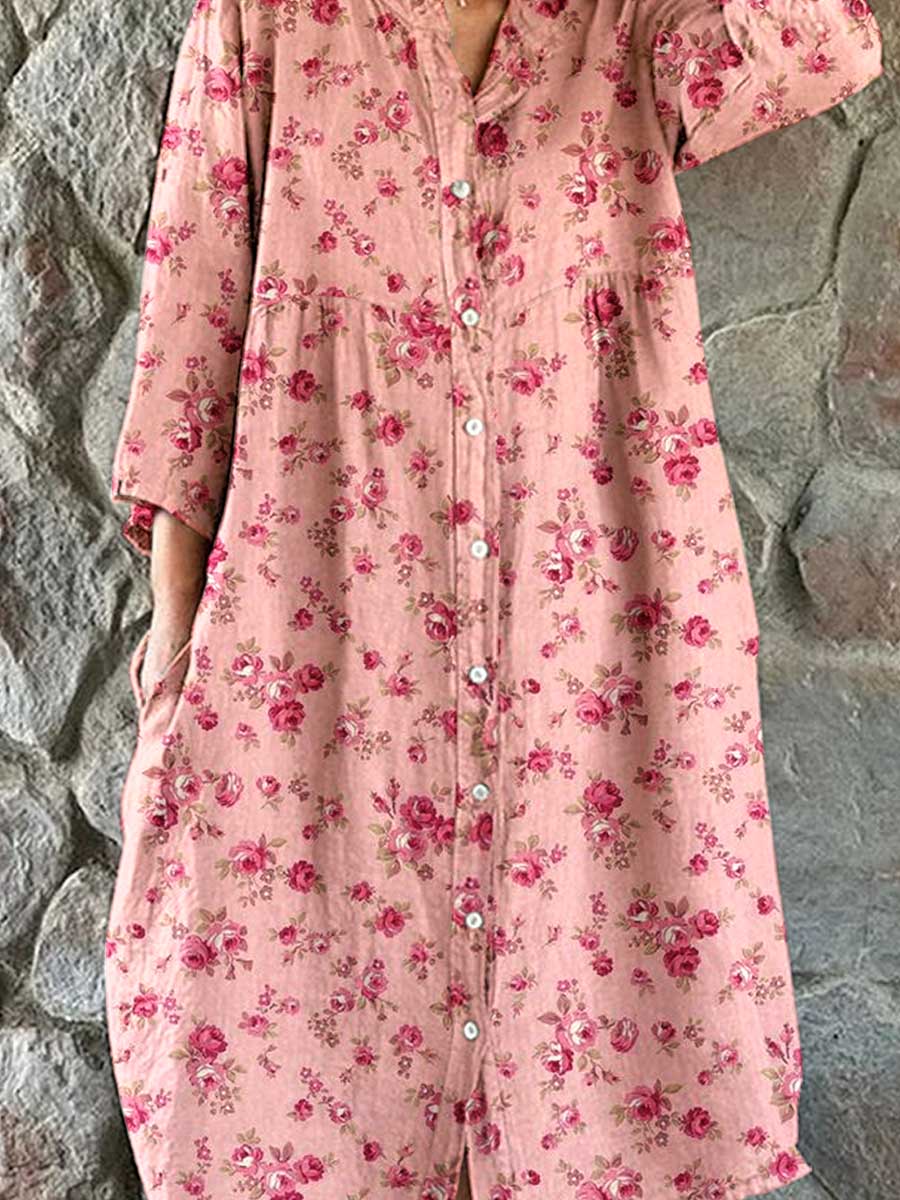 Women's Resort Art Rose Floral Pattern Cotton Shirt Dress