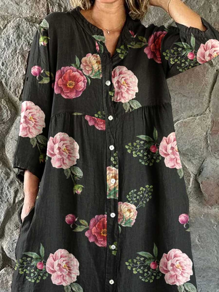Women's Resort Art Rose Floral Pattern Cotton Shirt Dress