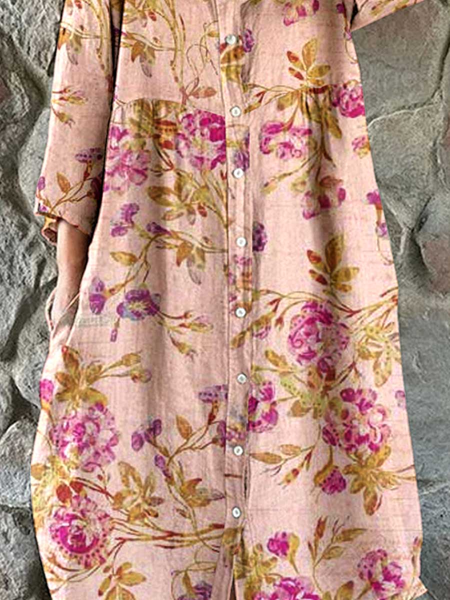 Women's Resort Rose Floral Pattern Cotton Shirt Dress